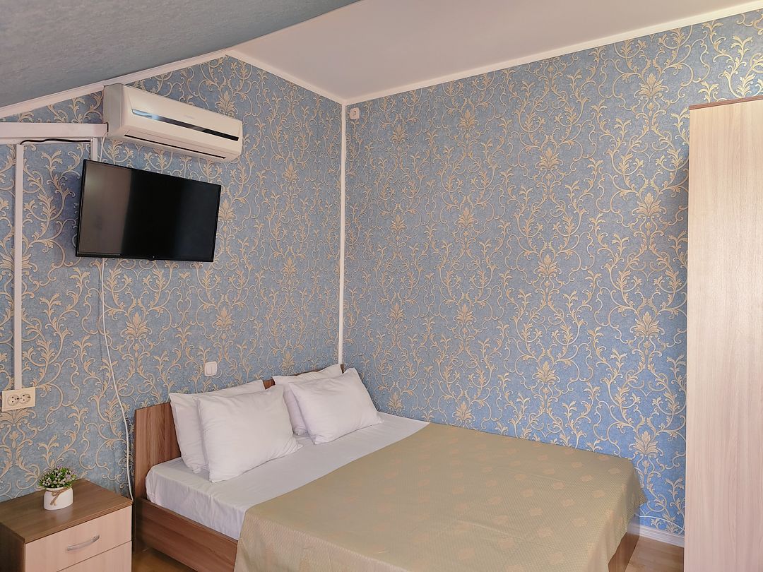 В номере: Двуспальная кровать, прикроватные тумбочки,журнальный столик, шкаф,вешалки,зеркало, телевизор, кондиционер, мини-холодильник, электрочайник, набор посуды. Ванная комната: душ, раковина, зеркало, туалет, сушилка для одежды.