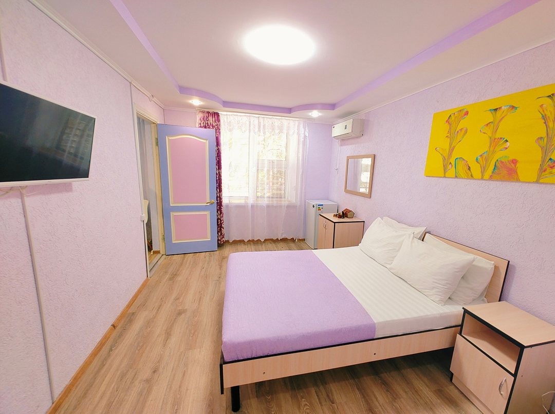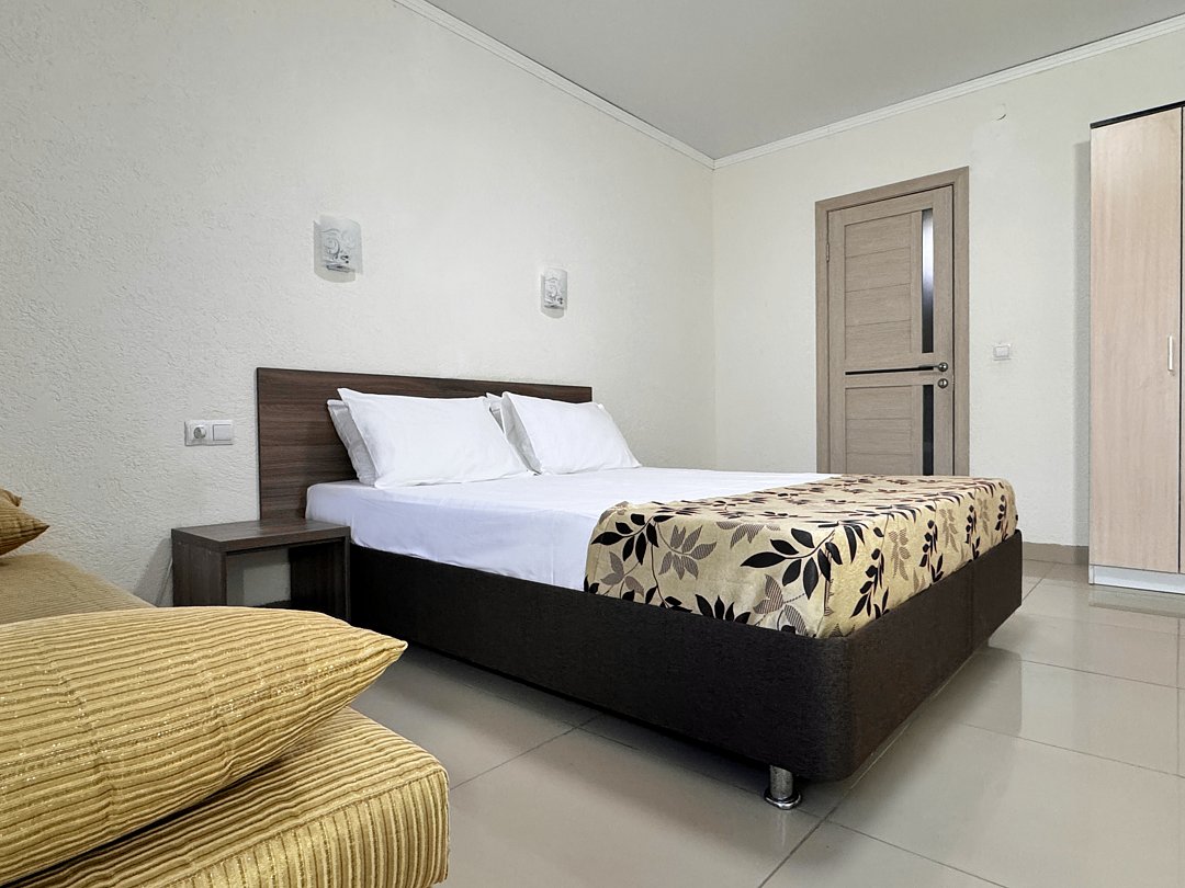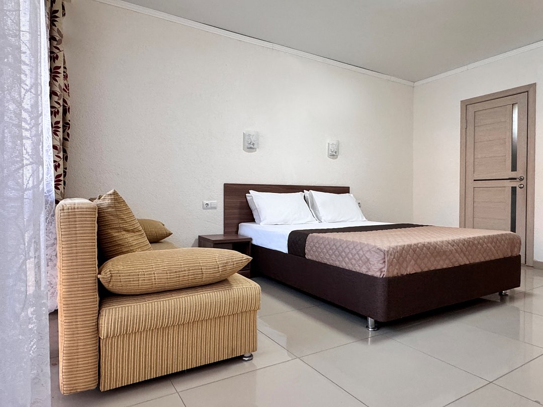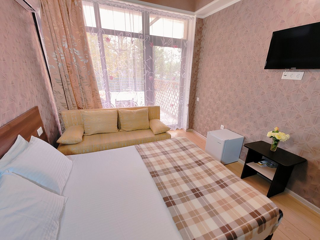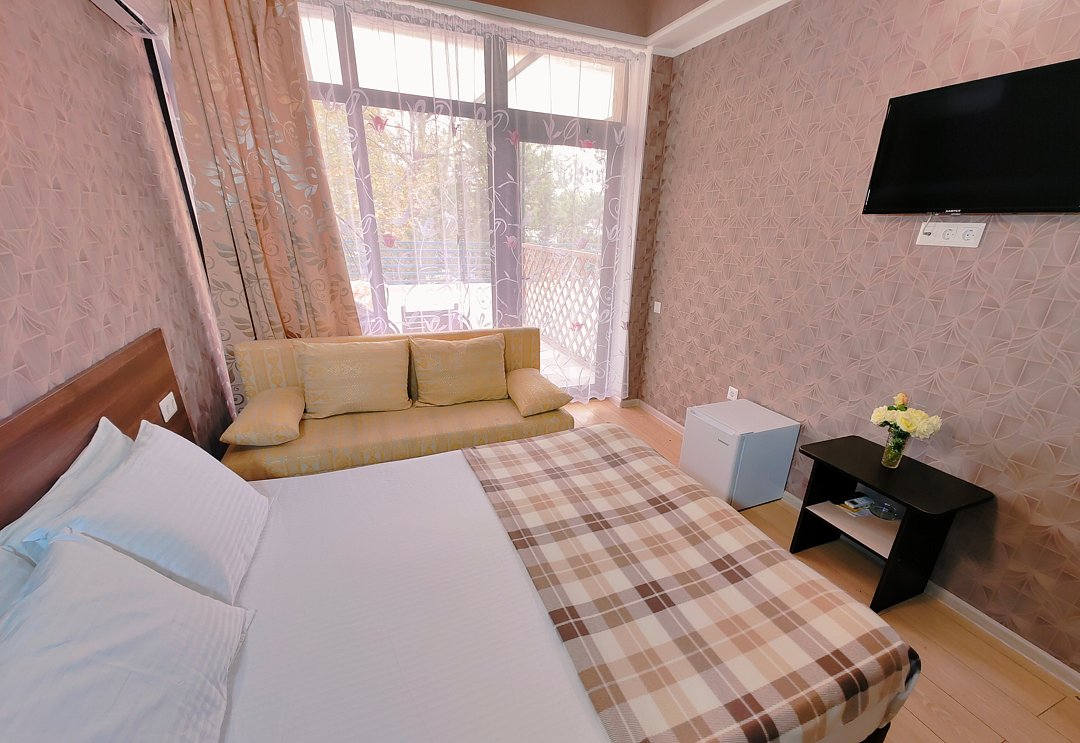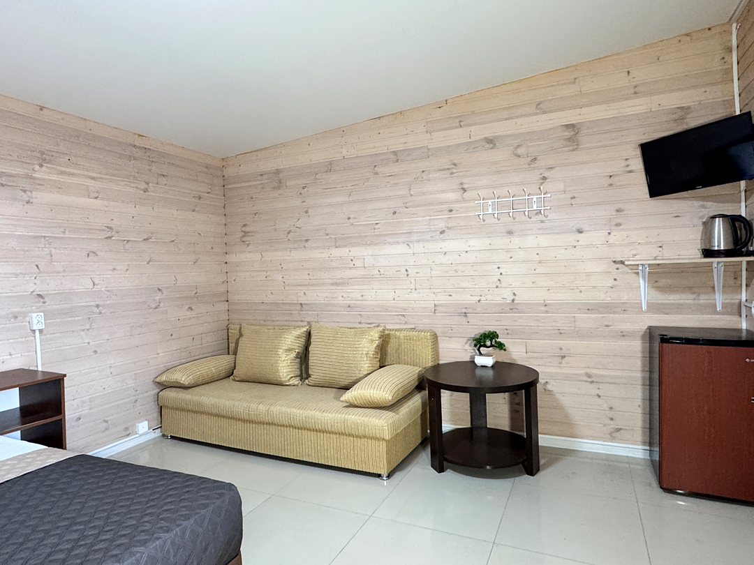 В номере: двуспальная кровать, двуспальный диван, прикроватные тумбочки,журнальный столик, шкаф,вешалки,зеркало, телевизор, кондиционер, мини-холодильник, электрочайник, набор посуды. Ванная комната: душ, раковина, зеркало, туалет, сушилка для одежды. Индивидуальная зона отдыха с отдельным входом в номер. (Проживание с животными разращено до 10 кг)В номере: двуспальная кровать, двуспальный диван, прикроватные тумбочки,журнальный столик, шкаф,вешалки,зеркало, телевизор, кондиционер, мини-холодильник, электрочайник, набор посуды. Ванная комната: душ, раковина, зеркало, туалет, сушилка для одежды. Индивидуальная зона отдыха с отдельным входом в номер.