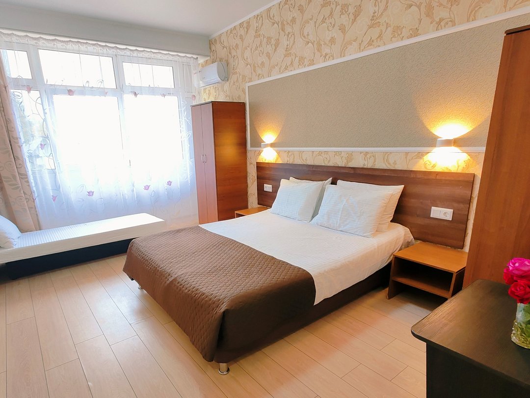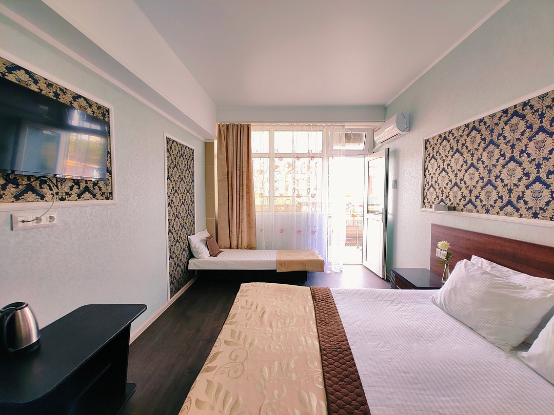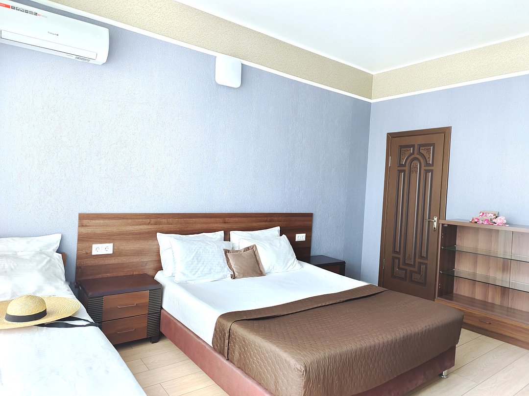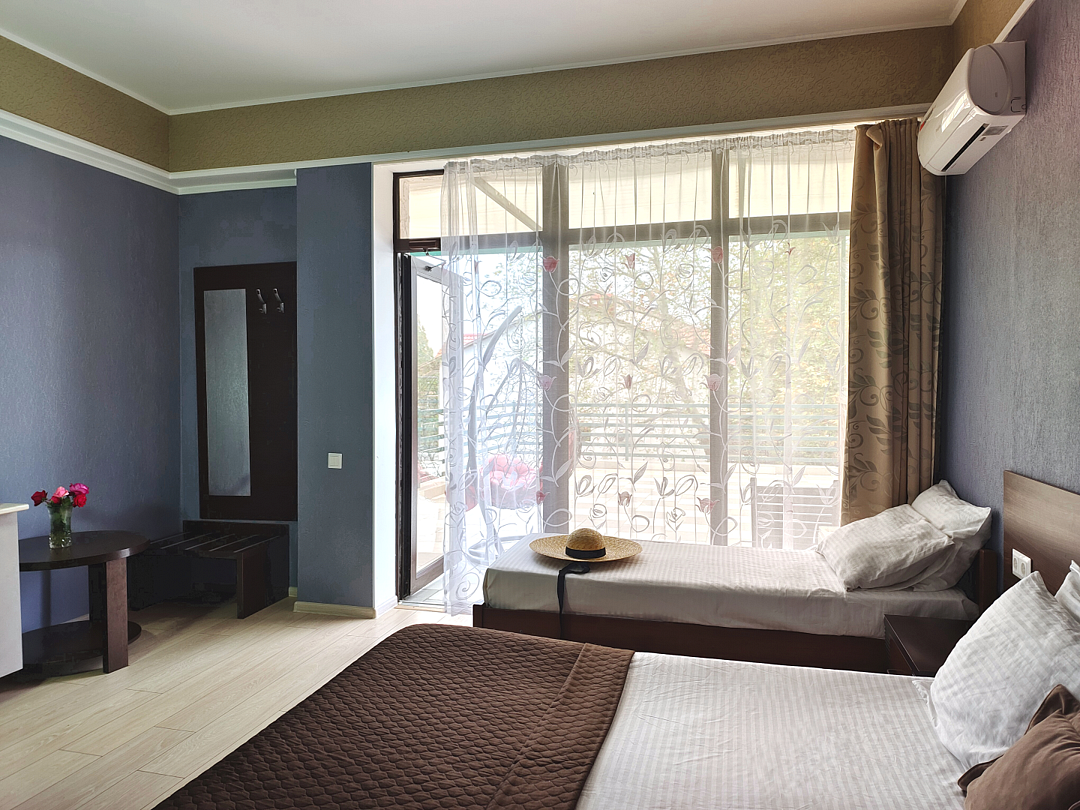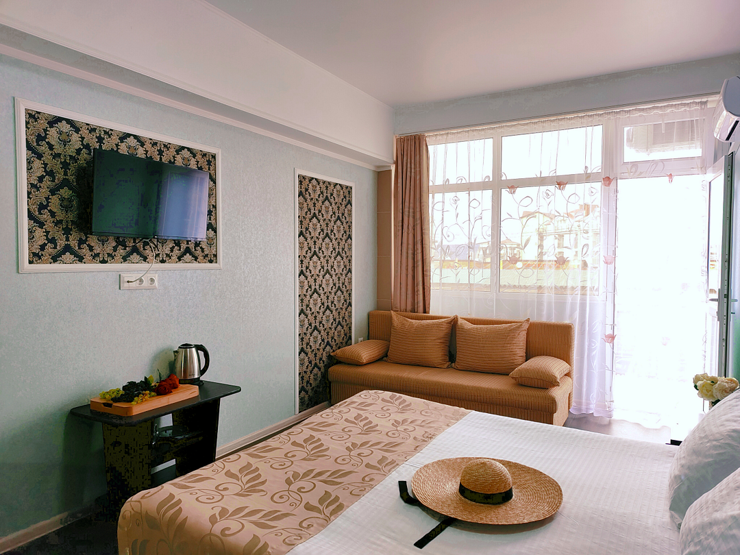 В номере: двуспальная кровать, двуспальный диван, прикроватные тумбочки,журнальный столик, шкаф,вешалки,зеркало, телевизор, кондиционер, мини-холодильник, электрочайник, набор посуды. Ванная комната: душ, раковина, зеркало, фен, туалет, сушилка для одежды. Балкон с летней мебелью. (Проживание с животными запрещено)В номере: двуспальня кровать, двуспальный диван, прикроватные тумбочки,журнальный столик, шкаф,вешалки,зеркало, телевизор, кондиционер, мини-холодильник, электрочайник, набор посуды. Ванная комната: душ, раковина, зеркало, фен, туалет, сушилка для одежды. Балкон с летней мебелью
