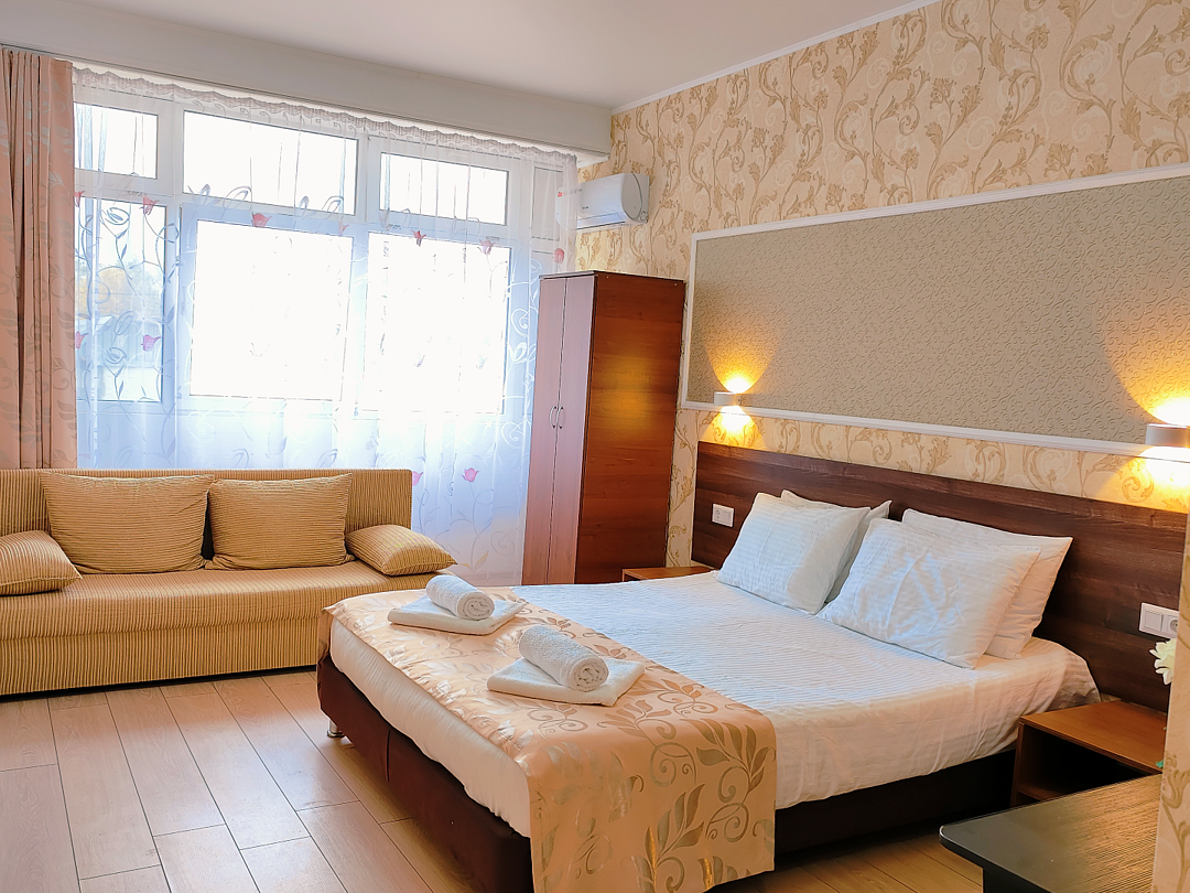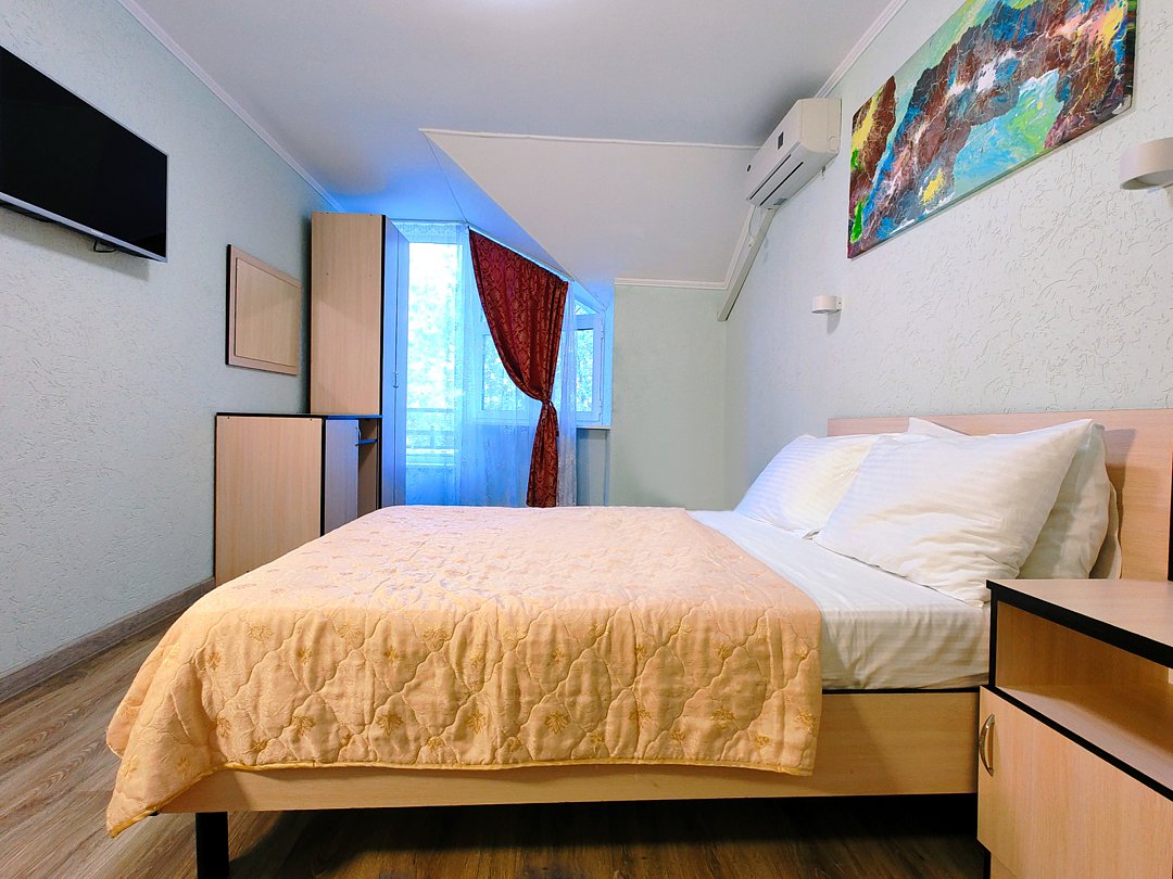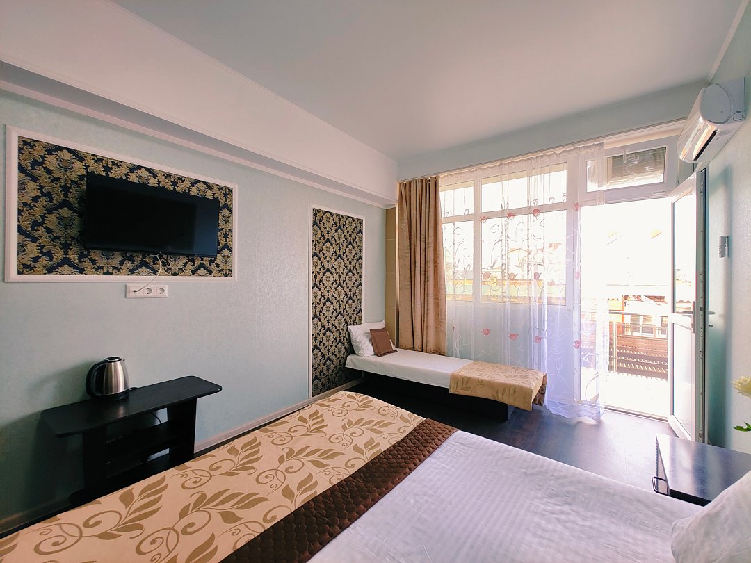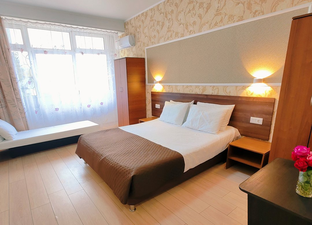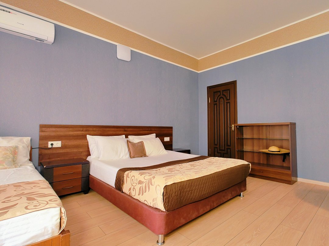 В номере: двуспальная кровать, двуспальный диван, прикроватные тумбочки,журнальный столик, шкаф,вешалки,зеркало, телевизор, кондиционер, мини-холодильник, электрочайник, набор посуды. Ванная комната: душ, раковина, зеркало, фен, туалет, сушилка для одежды. Балкон с летней мебелью. (Проживание с животными запрещено)В номере: двуспальня кровать, двуспальный диван, прикроватные тумбочки,журнальный столик, шкаф,вешалки,зеркало, телевизор, кондиционер, мини-холодильник, электрочайник, набор посуды. Ванная комната: душ, раковина, зеркало, фен, туалет, сушилка для одежды. Балкон с летней мебелью