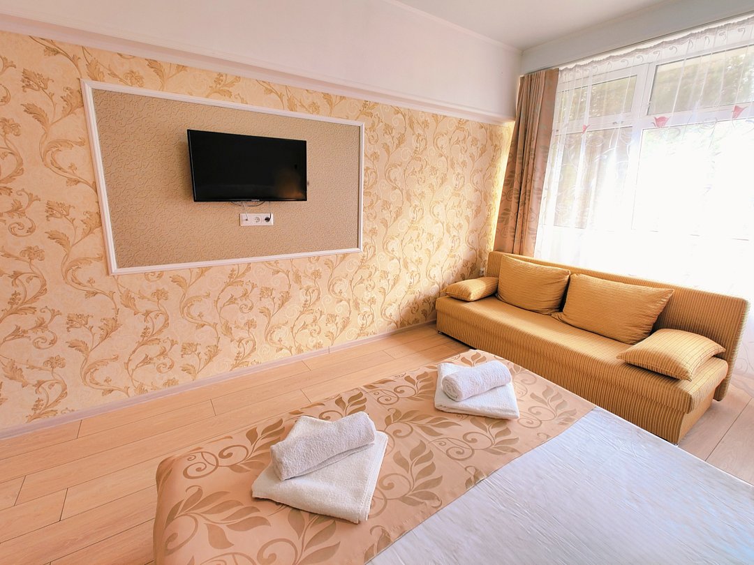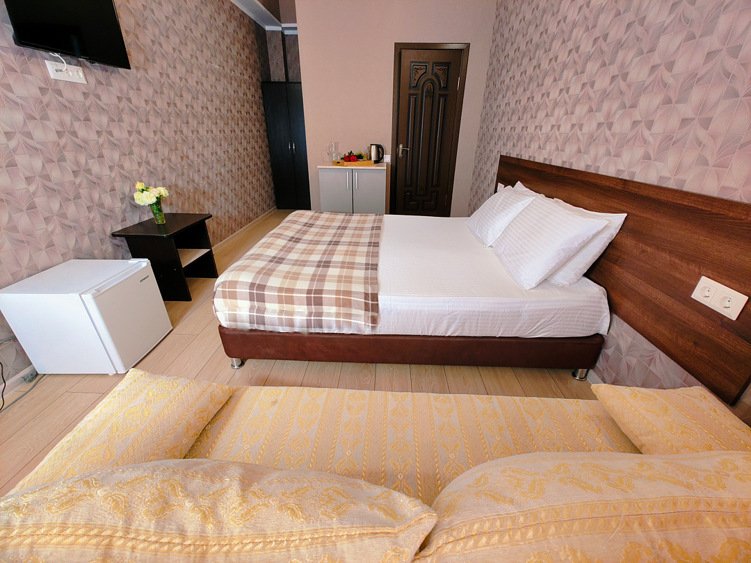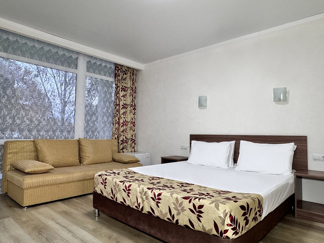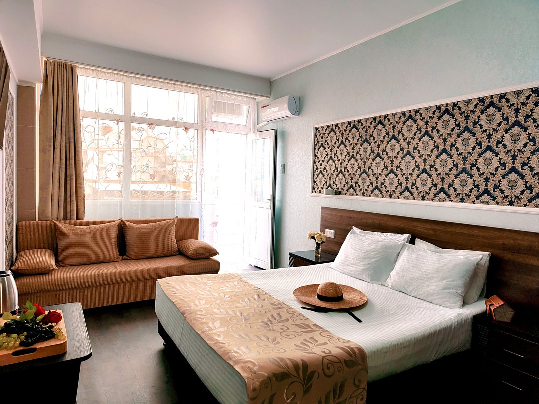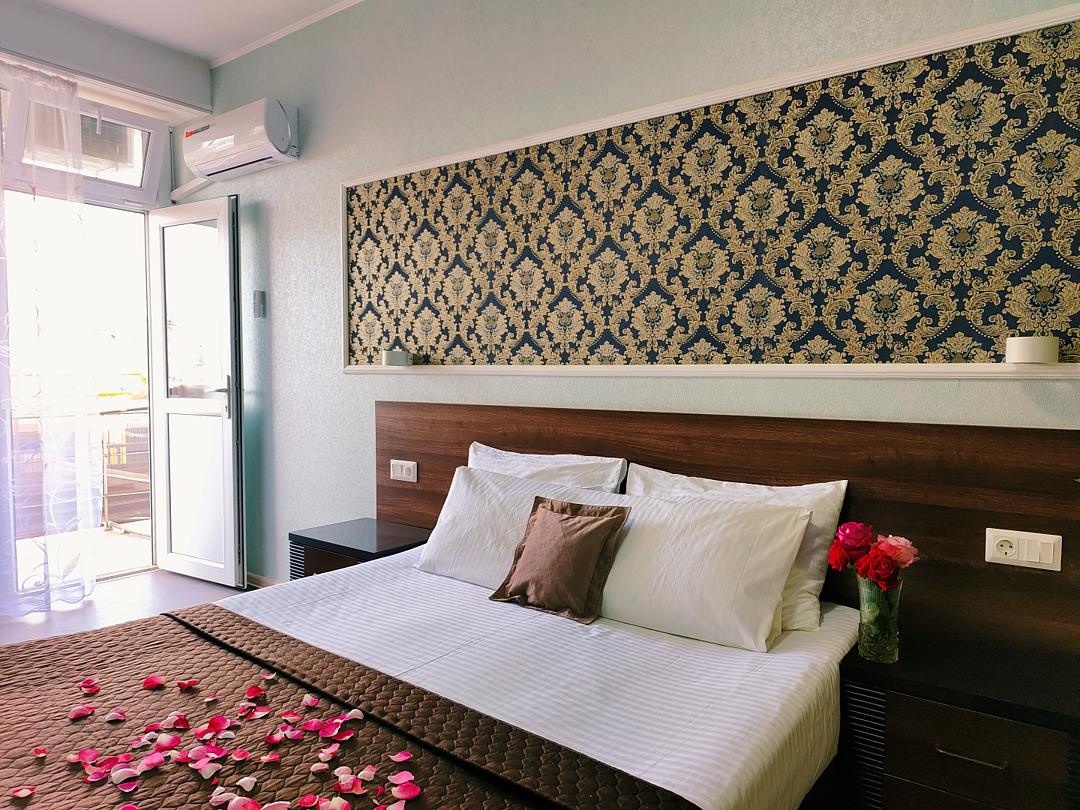 В номере: двуспальная кровать, двуспальный диван, прикроватные тумбочки,журнальный столик, шкаф,вешалки,зеркало, телевизор, кондиционер, мини-холодильник, электрочайник, набор посуды. Ванная комната: душ, раковина, зеркало, фен, туалет, сушилка для одежды. Балкон с летней мебелью. (Проживание с животными запрещено)В номере: двуспальня кровать, двуспальный диван, прикроватные тумбочки,журнальный столик, шкаф,вешалки,зеркало, телевизор, кондиционер, мини-холодильник, электрочайник, набор посуды. Ванная комната: душ, раковина, зеркало, фен, туалет, сушилка для одежды. Балкон с летней мебелью