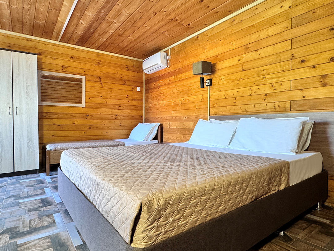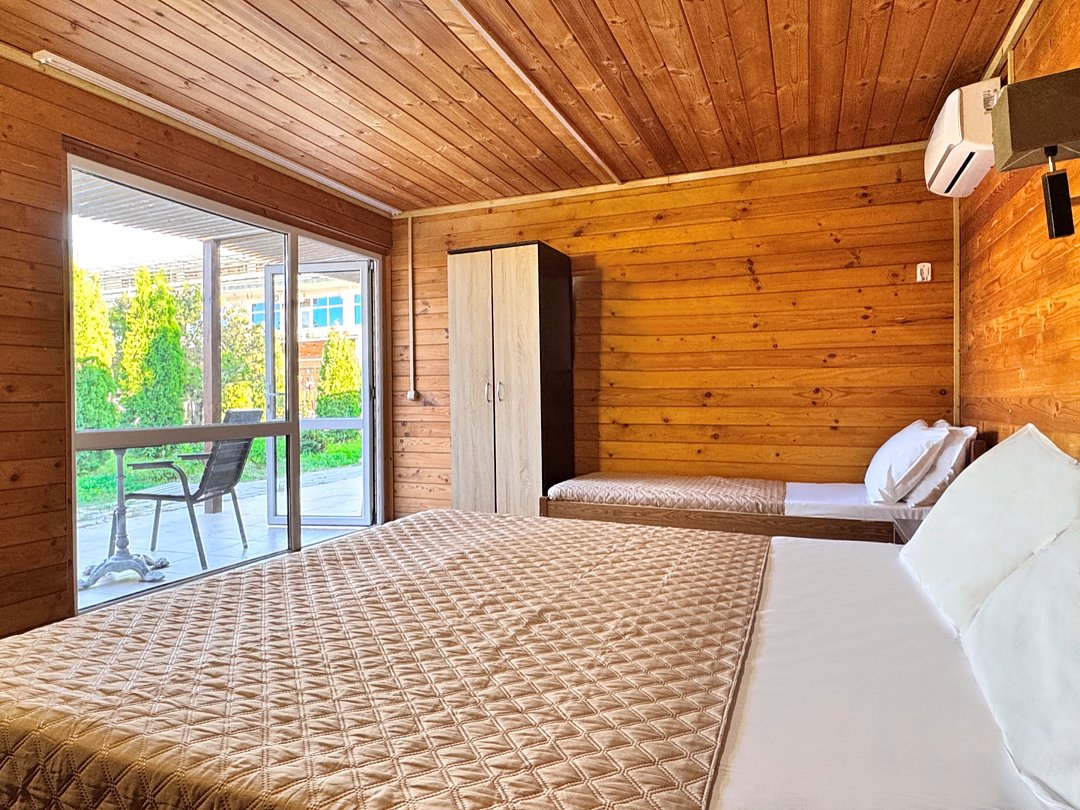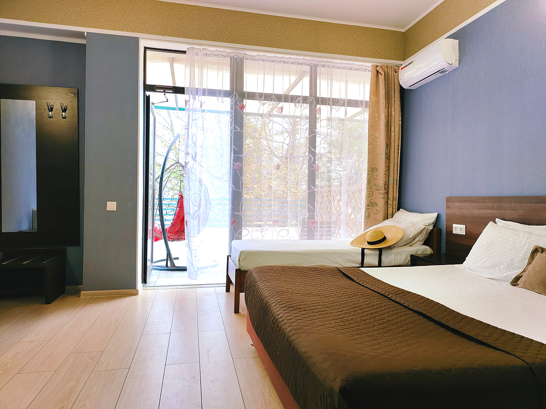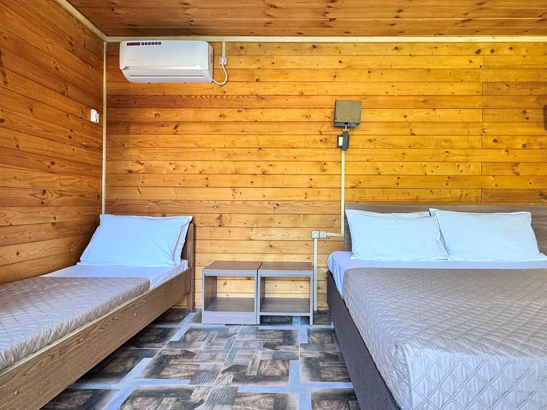 В номере: двуспальная кровать, односпальная кровать, прикроватные тумбочки,журнальный столик, шкаф,вешалки,зеркало, телевизор, кондиционер, мини-холодильник, электрочайник, набор посуды. Ванная комната: душ, раковина, зеркало, туалет, сушилка для одежды. Индивидуальная зона отдыха с отдельным входом в номер.