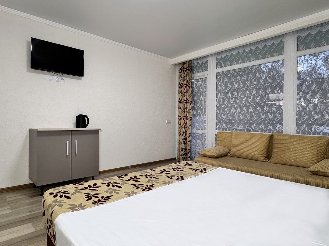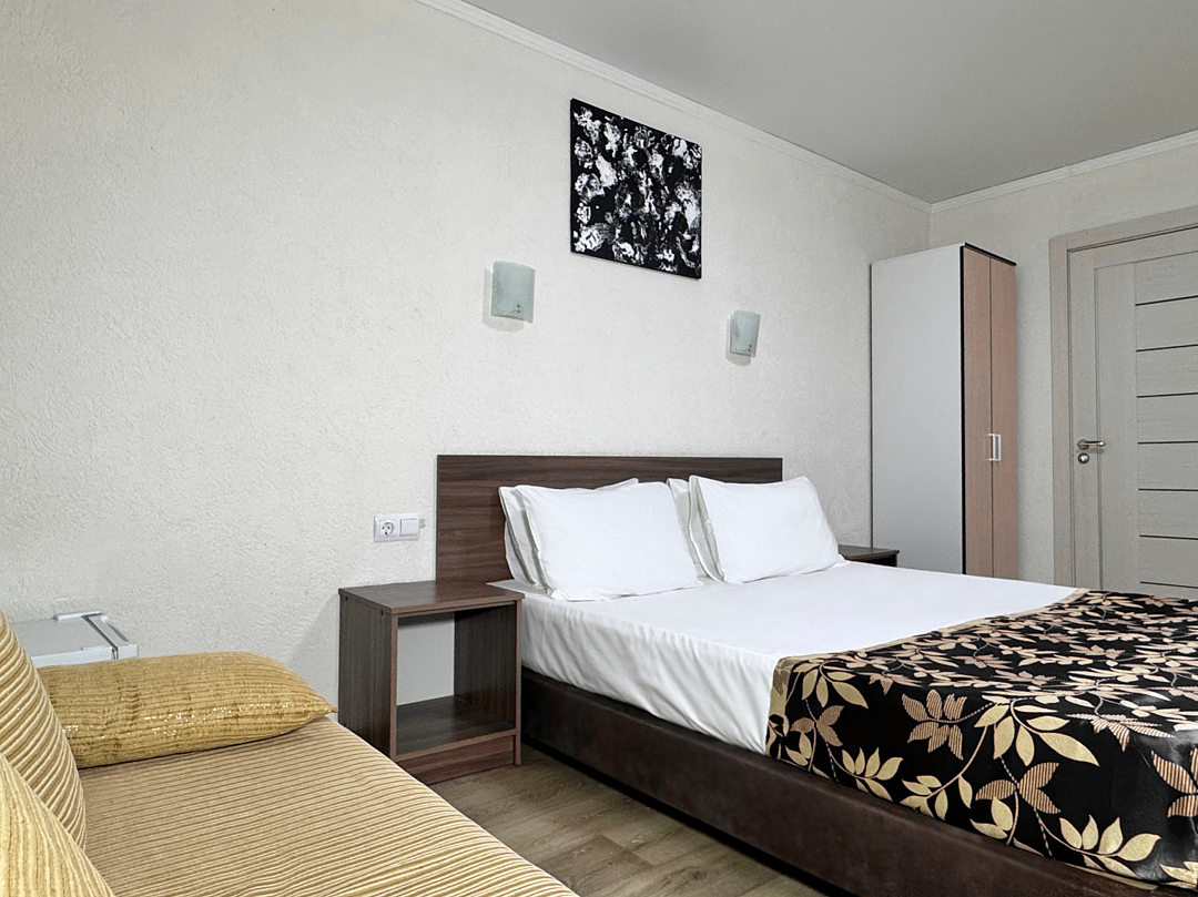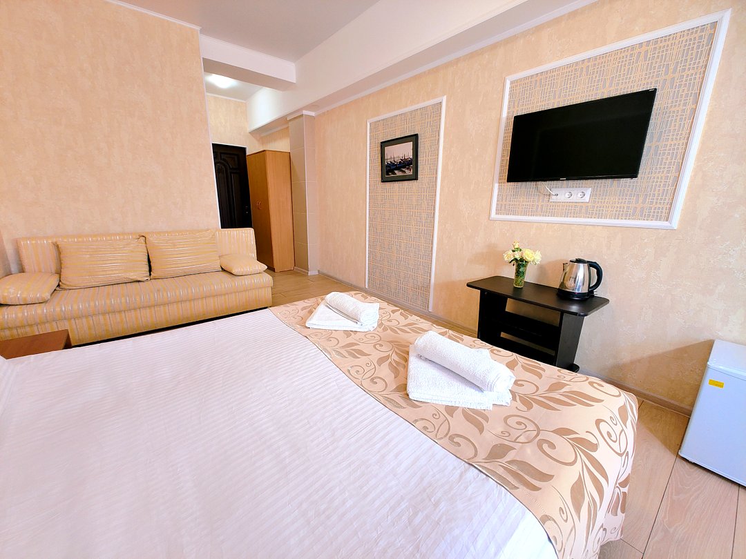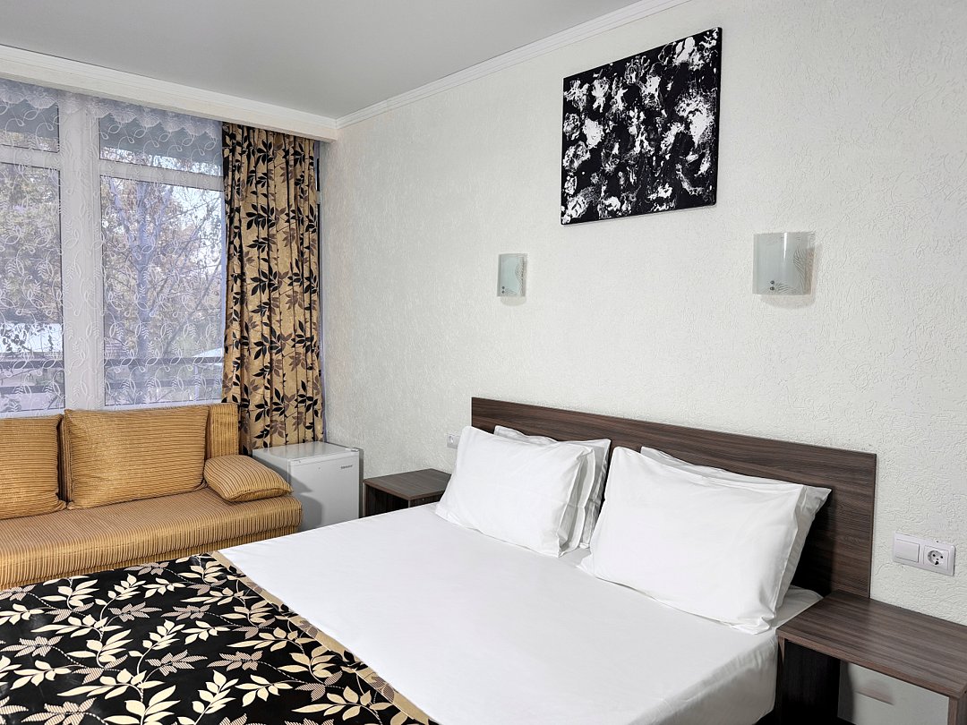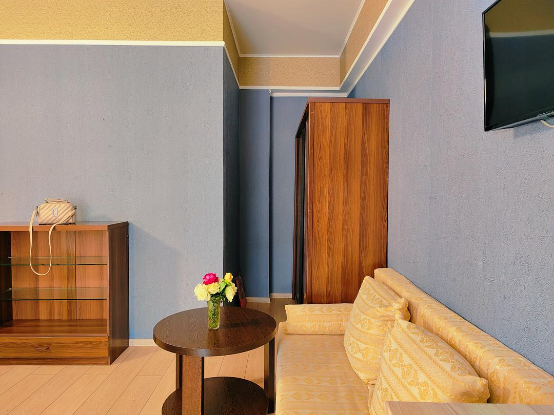 В номере: двуспальная кровать, двуспальный диван, прикроватные тумбочки,журнальный столик, комод, шкаф,вешалки,зеркало, телевизор, кондиционер, мини-холодильник, электрочайник, набор посуды. Ванная комната: душ, раковина, зеркало, фен, туалет, сушилка для одежды. Зона отдыха перед входом в номер. (Проживание с животными запрещено)В номере: двуспальная кровать, двуспальный диван, прикроватные тумбочки,журнальный столик, комод, шкаф,вешалки,зеркало, телевизор, кондиционер, мини-холодильник, электрочайник, набор посуды. Ванная комната: душ, раковина, зеркало, фен, туалет, сушилка для одежды. Зона отдыха перед входом в номер.