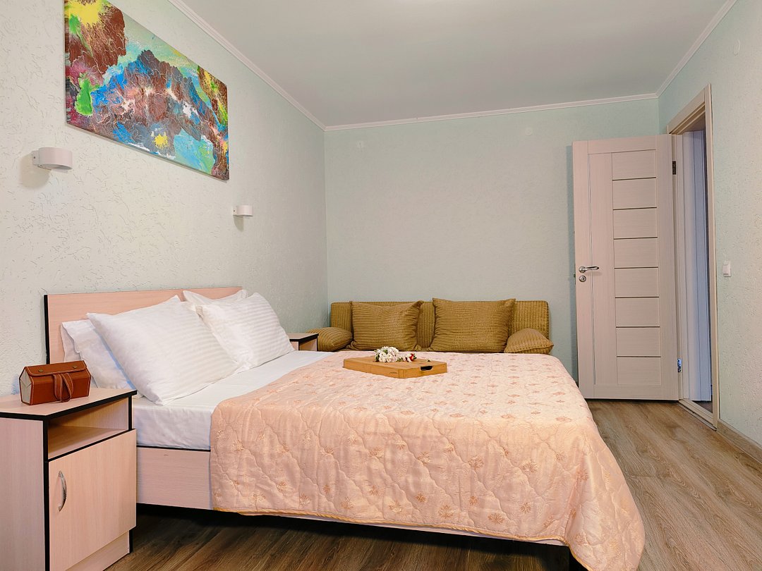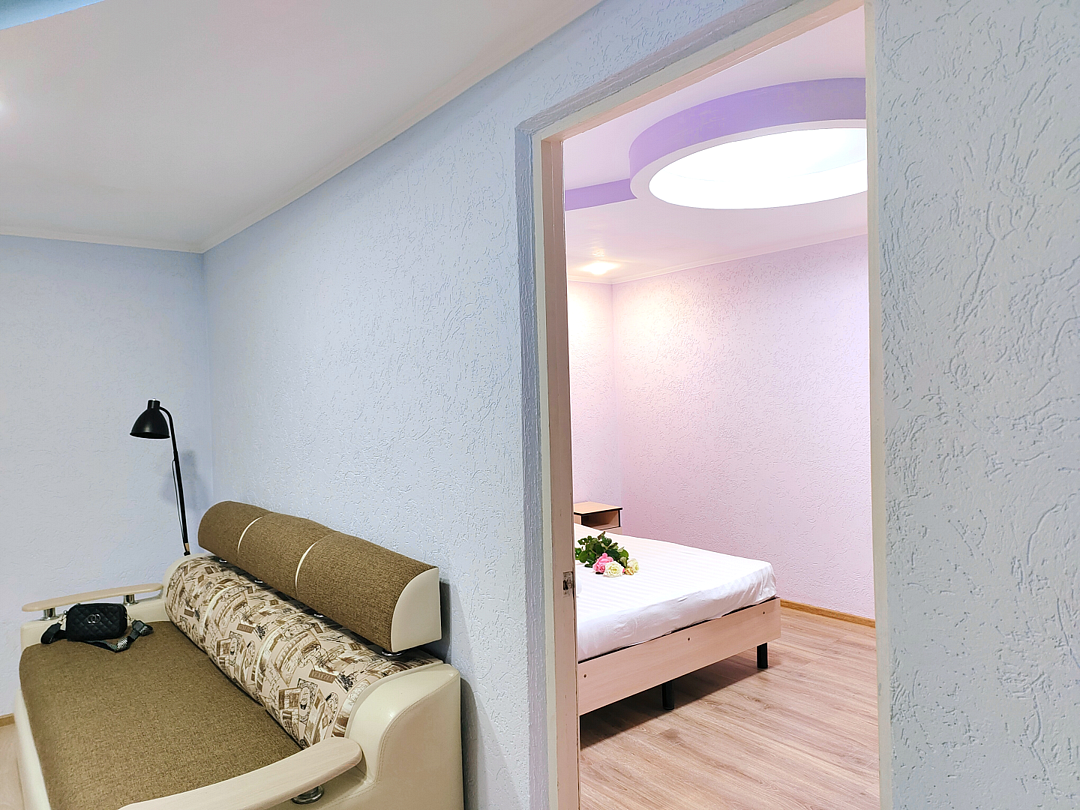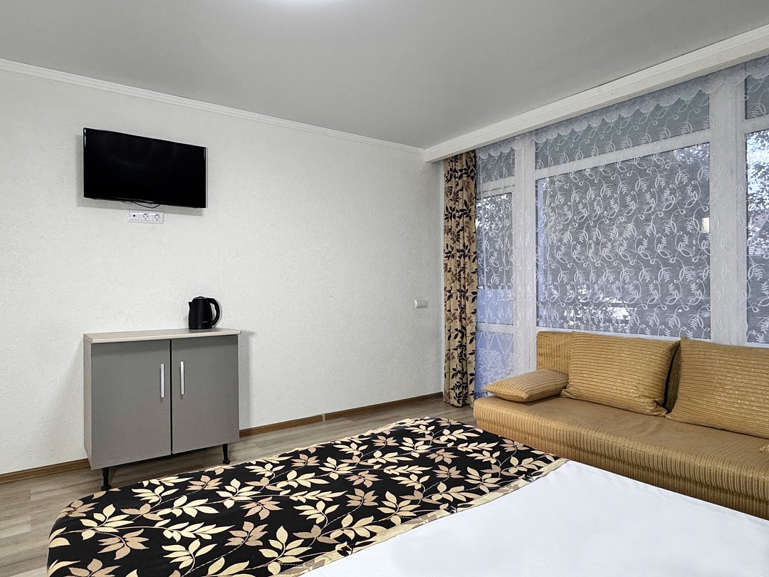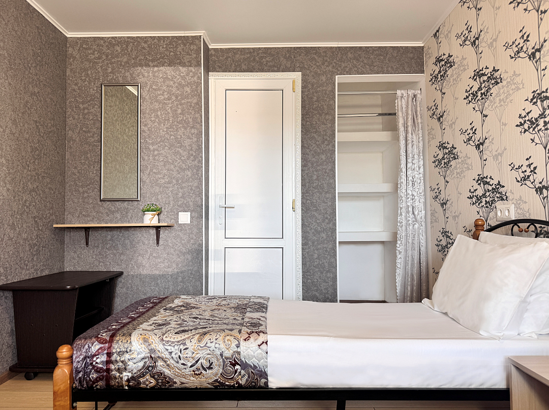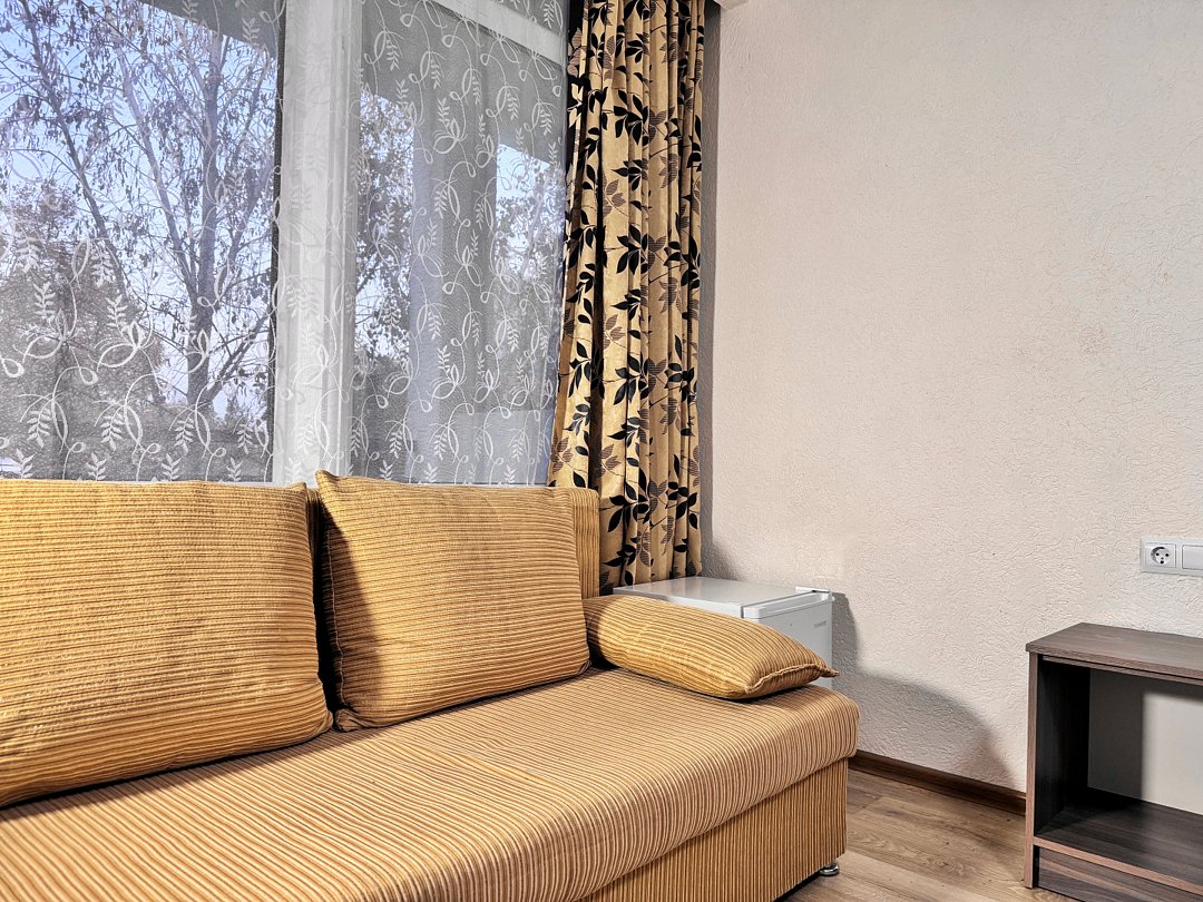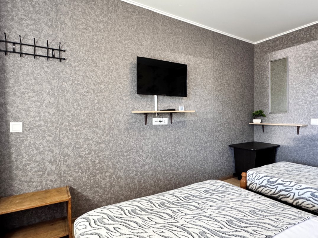 В номере: двуспальная кровать, двуспальный диван, прикроватные тумбочки,журнальный столик, комод, шкаф,вешалки,зеркало, телевизор, кондиционер, мини-холодильник, электрочайник, набор посуды. Ванная комната: душ, раковина, зеркало, фен, туалет, сушилка для одежды. Зона отдыха перед входом в номер. (Проживание с животными запрещено)В номере: двуспальная кровать, двуспальный диван, прикроватные тумбочки,журнальный столик, комод, шкаф,вешалки,зеркало, телевизор, кондиционер, мини-холодильник, электрочайник, набор посуды. Ванная комната: душ, раковина, зеркало, фен, туалет, сушилка для одежды. Зона отдыха перед входом в номер.