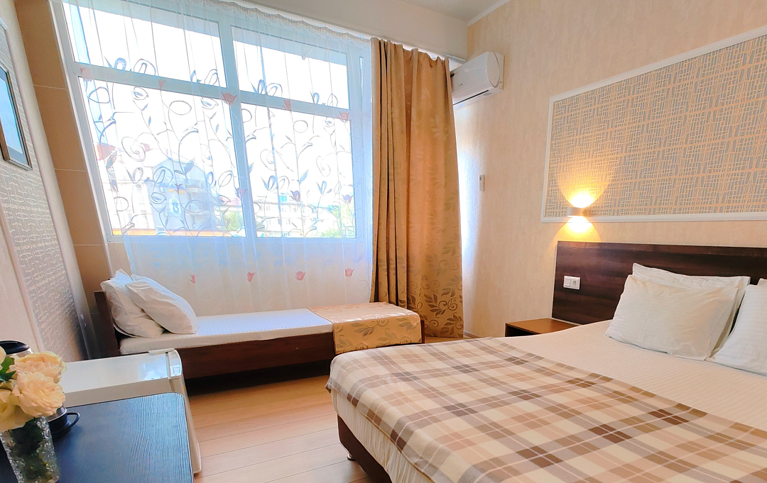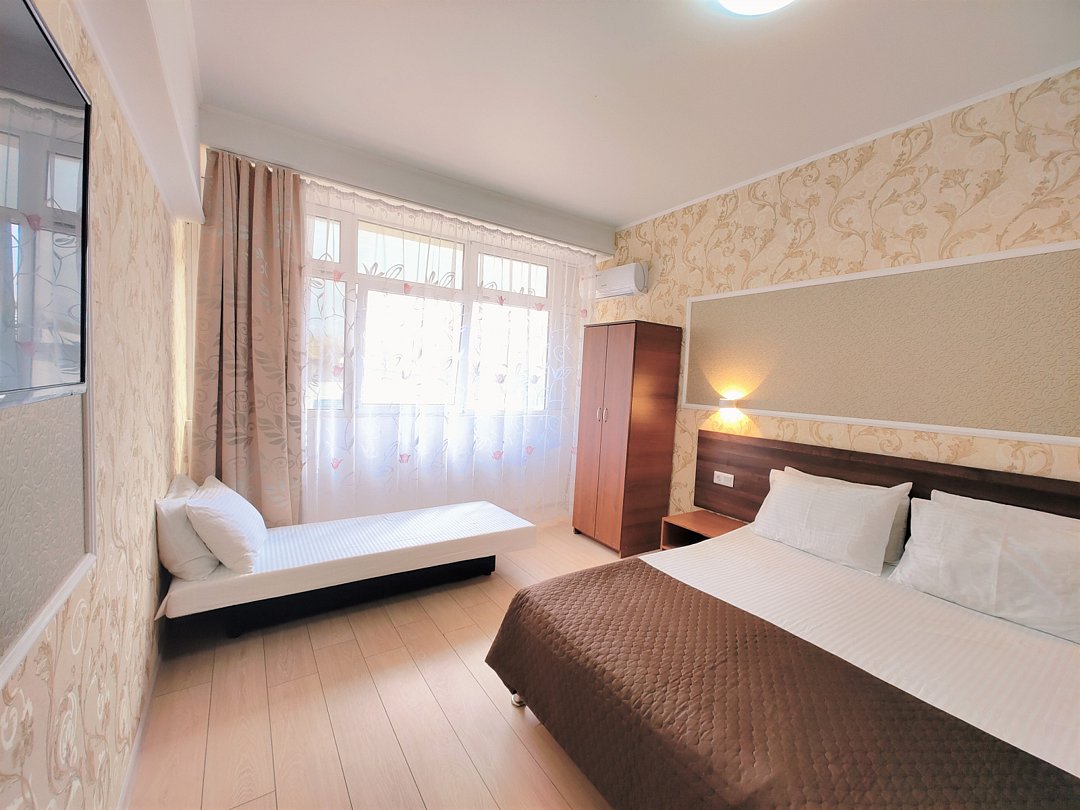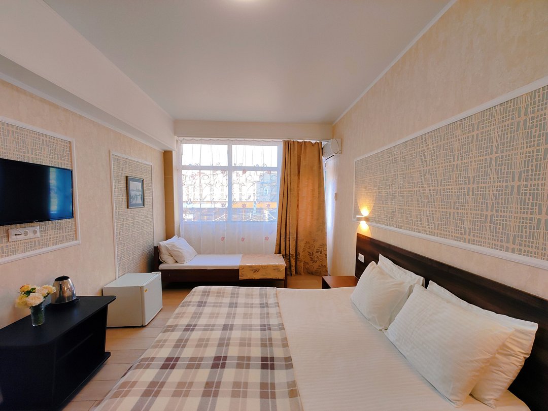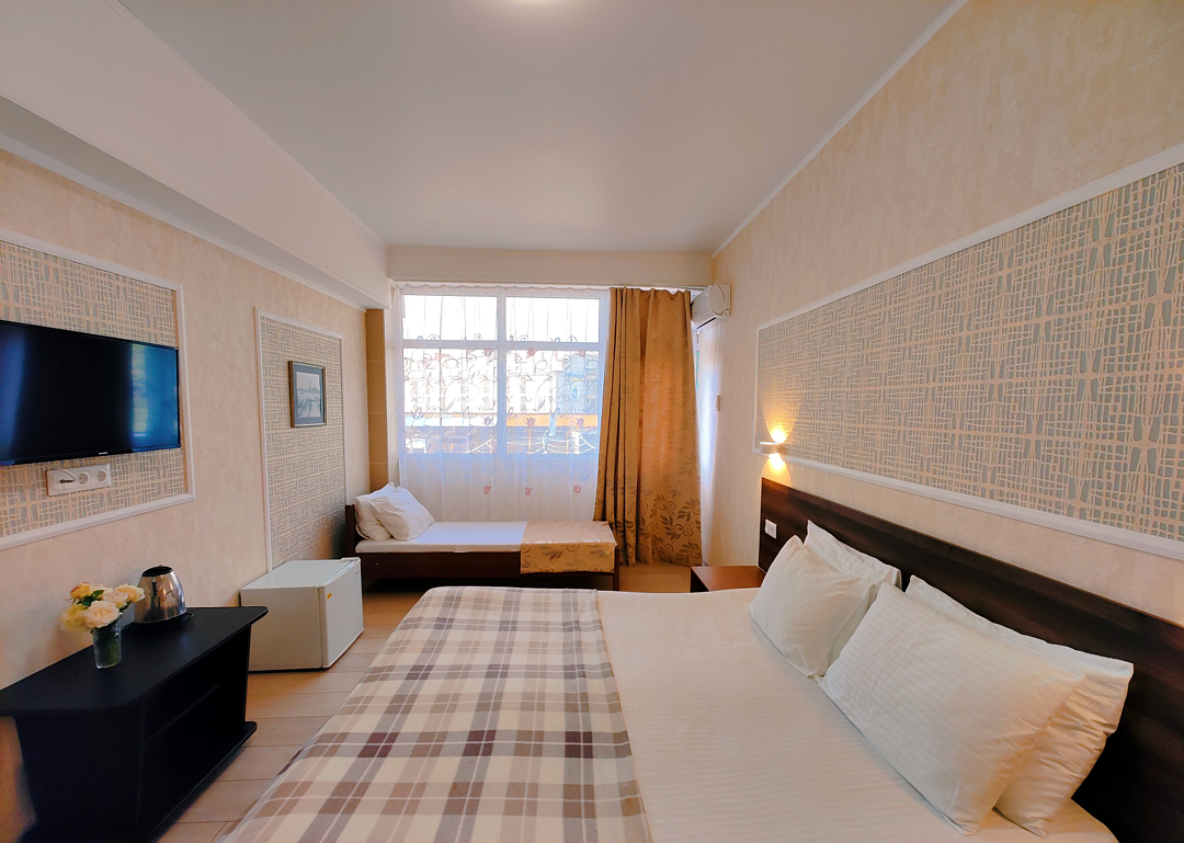 В номере: двуспальная кровать, односпальный диван, односпальный диван, прикроватные тумбочки,журнальный столик, комод, шкаф,вешалки,зеркало, телевизор, кондиционер, мини-холодильник, электрочайник, набор посуды. Ванная комната: душ, раковина, зеркало, фен, туалет, сушилка для одежды. Зона отдыха перед входом в номер. (Проживание с животными запрещено)В номере: двуспальная кровать, односпальный диван, прикроватные тумбочки,журнальный столик, комод, шкаф,вешалки,зеркало, телевизор, кондиционер, мини-холодильник, электрочайник, набор посуды. Ванная комната: душ, раковина, зеркало, фен, туалет, сушилка для одежды. Зона отдыха перед входом в номер.