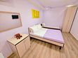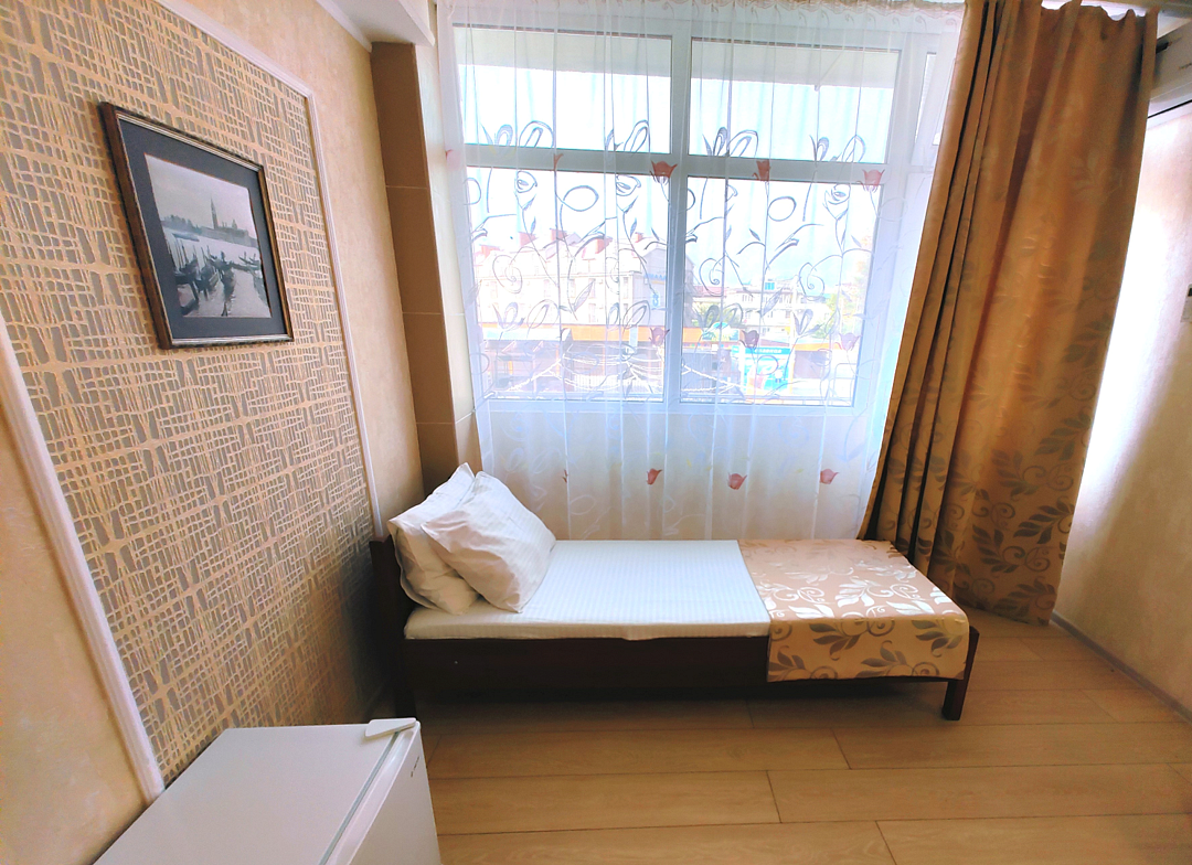 В номере: односпальная кровать, прикроватные тумбочки,журнальный столик, встроенный шкаф,вешалки,зеркало, телевизор, кондиционер, мини-холодильник, электрочайник, набор посуды. Ванная комната: душ, раковина, зеркало, фен, туалет.