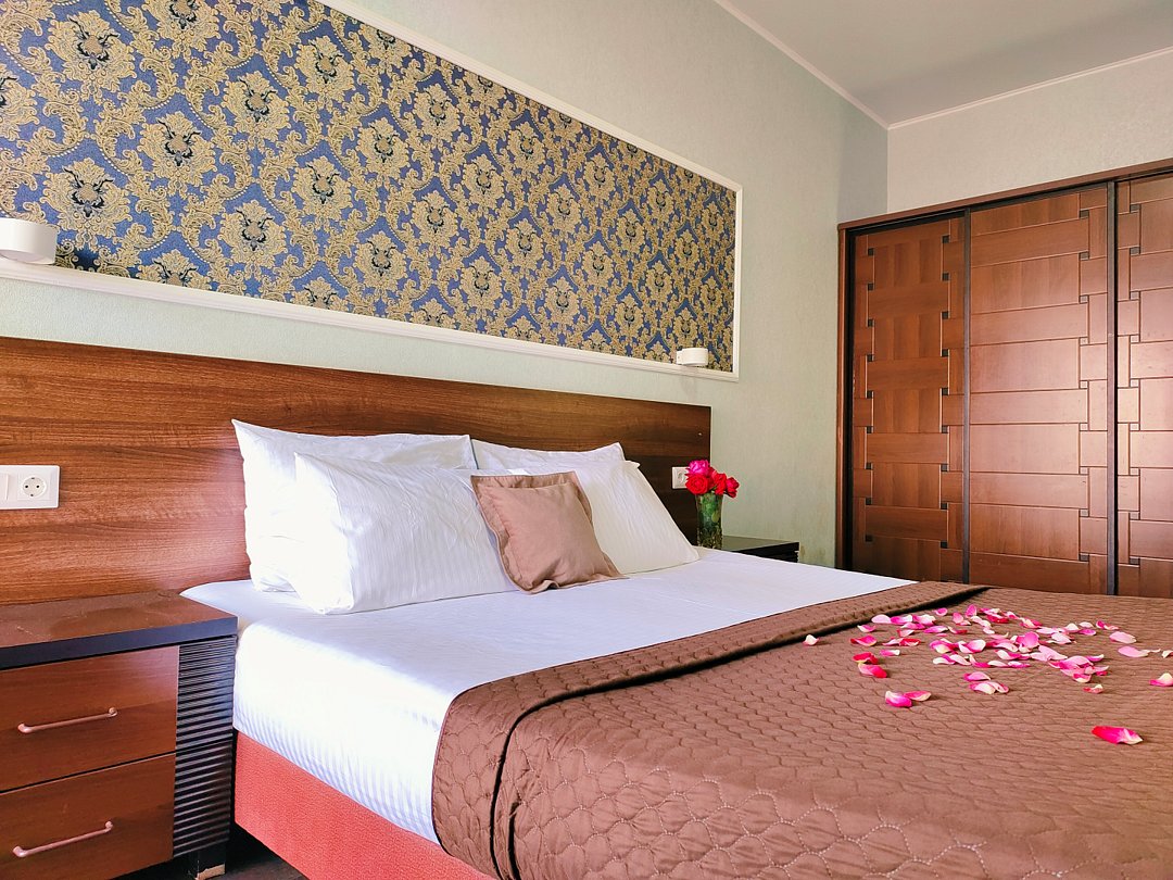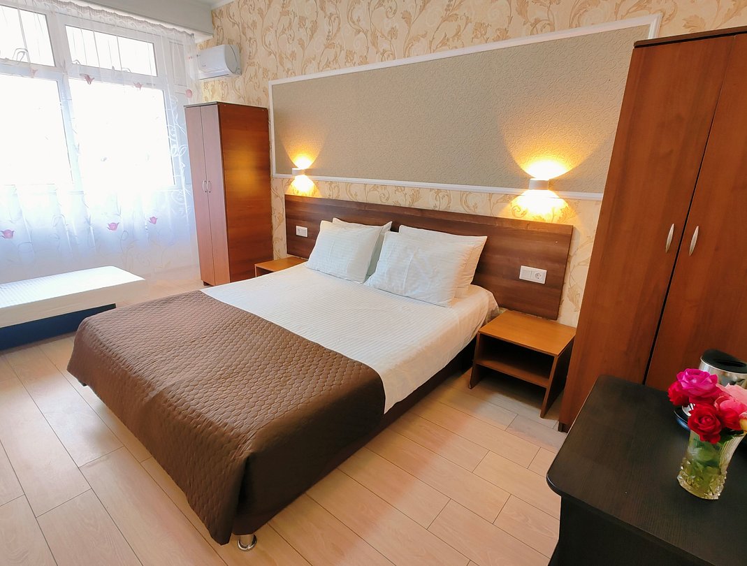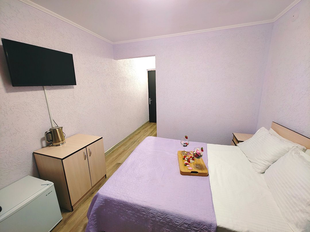 В номере: двуспальная кровать, прикроватные тумбочки,журнальный столик, комод, шкаф,вешалки,зеркало, телевизор, кондиционер, мини-холодильник, электрочайник, набор посуды. Ванная комната: душ, раковина, зеркало, фен, туалет, сушилка для одежды. Зона отдыха перед входом в номер. (Проживание с животными запрещено)В гостиничном номере