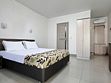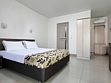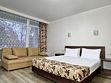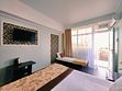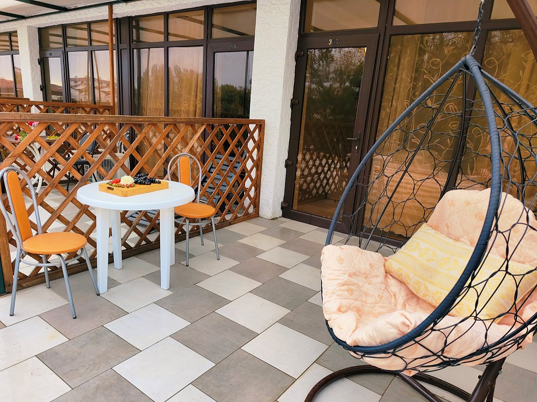 В номере: двуспальня кровать, двуспальный диван, прикроватные тумбочки,журнальный столик, шкаф,вешалки,зеркало, телевизор, кондиционер, мини-холодильник, электрочайник, набор посуды. Ванная комната: душ, раковина, зеркало, фен, туалет, сушилка для одежды. Балкон с летней мебелью