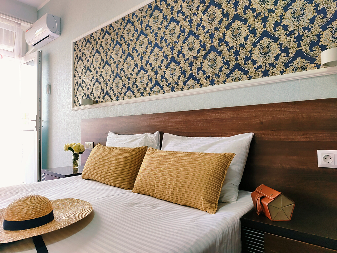 В номере: двуспальная кровать, прикроватные тумбочки,журнальный столик, шкаф,вешалки,зеркало, телевизор, кондиционер, мини-холодильник, электрочайник, набор посуды. Ванная комната: душ, раковина, зеркало, фен, туалет, сушилка для одежды. Балкон с летней мебелью