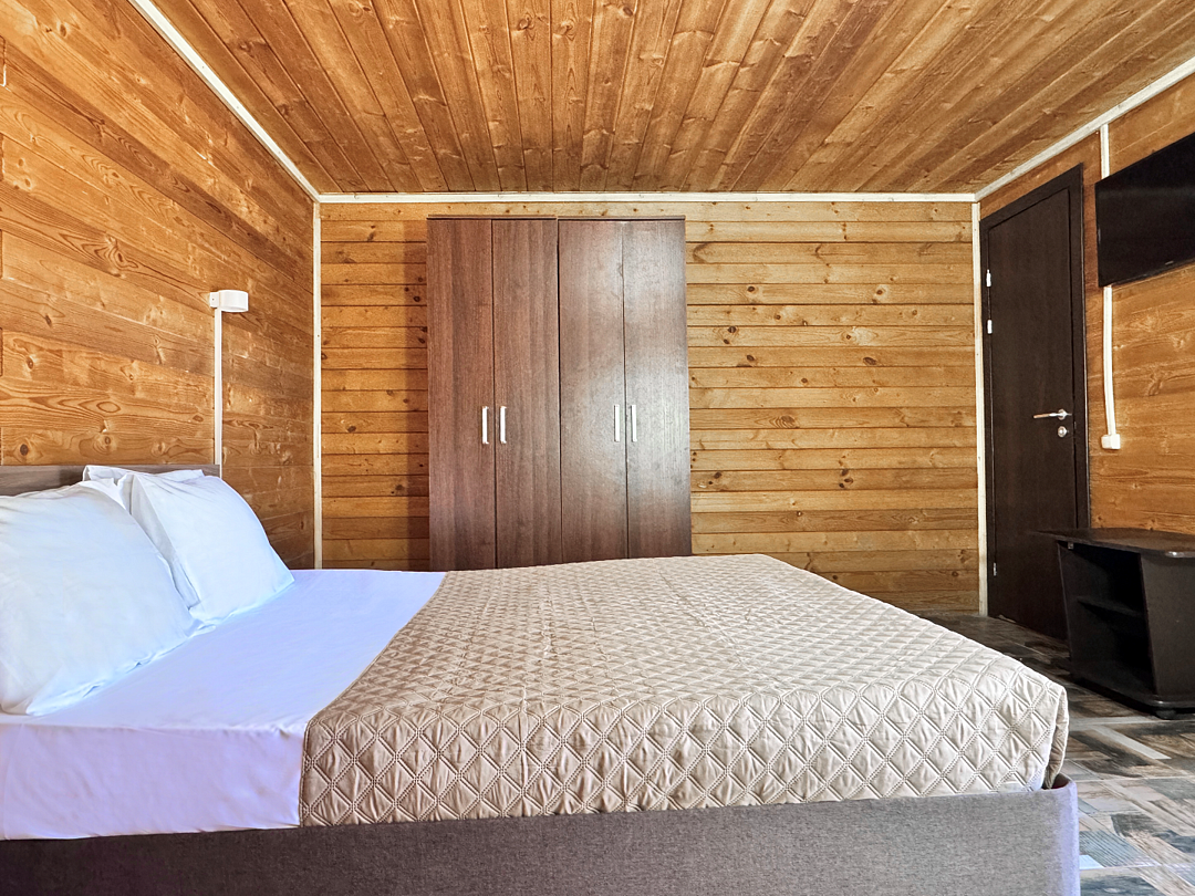 В номере: двуспальная кровать, прикроватные тумбочки,журнальный столик, шкаф,вешалки,зеркало, телевизор, кондиционер, мини-холодильник, электрочайник, набор посуды. Ванная комната: душ, раковина, зеркало, туалет, сушилка для одежды. Индивидуальная зона отдыха с отдельным входом в номер.