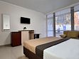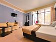 В номере: двуспальная кровать, односпальный диван, прикроватные тумбочки,журнальный столик, комод, шкаф,вешалки,зеркало, телевизор, кондиционер, мини-холодильник, электрочайник, набор посуды. Ванная комната: душ, раковина, зеркало, фен, туалет, сушилка для одежды. Зона отдыха перед входом в номер.