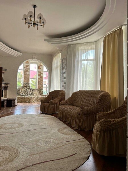 3-х этажный дом «Прованс» с шестью спальнями. На первом этаже прихожая. На втором этаже: гостиная, три спальни, два санузла, кухня-столовая, фонтан, камин, прихожая. В гостиной: диван, два кресла и телевизор. В первой спальне: двухспальная кровать и двухспальный диван, шкаф, две прикроватные тумбочки, трюмо.