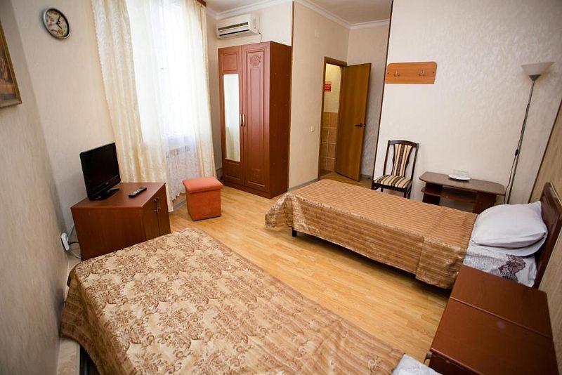 В номере три односпальные кровати или одна двуспальная и одна односпальная кровать. Наполняемость номера: журнальный столик, пуфик, прикроватные тумбочки, шкаф для одежды, вешалка для верхней одежды, зеркало, ТВ, мини-холодильник, WI-FI. Также в номере совмещённый санузел: душ, раковина, зеркало, унитаз, туалетные принадлежности, полотенца, крючки для полотенец.