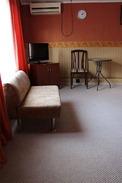 Наполняемость номера: журнальный столик, пуфик, прикроватная тумбочка, шкаф для одежды, вешалка для верхней одежды, зеркало, ТВ, мини-холодильник, WI-FI. Также в номере совмещённый санузел: душ, раковина, зеркало, унитаз, туалетные принадлежности, полотенца, крючки для полотенец.