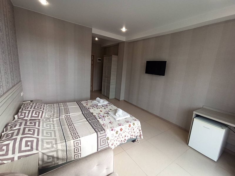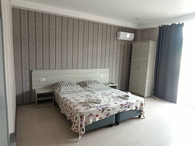 Двухместный полулюкс без балкона, расположен на первом этаже гостиницы, общей площадью 15 кв.м. В номере представлены кровати спринг бокс, сан узел. Оснащен кондиционером, ТВ, шкафом, прикроватными тумбочками, столик.