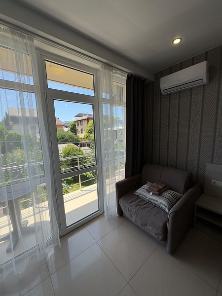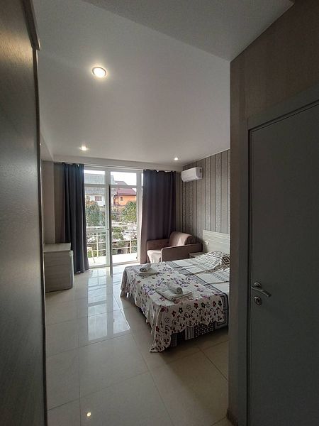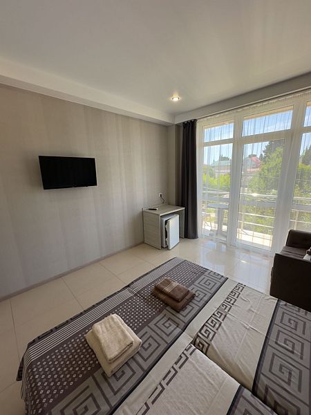 Трехместный полулюкс без балкона, расположен на первом этаже гостиницы, общей площадью 20кв.м. В номере представлены кровати спринг бокс и раскладное мягкое кресло, сан узел. Оснащен кондиционером, ТВ, шкафом, прикроватными тумбочками, столик.