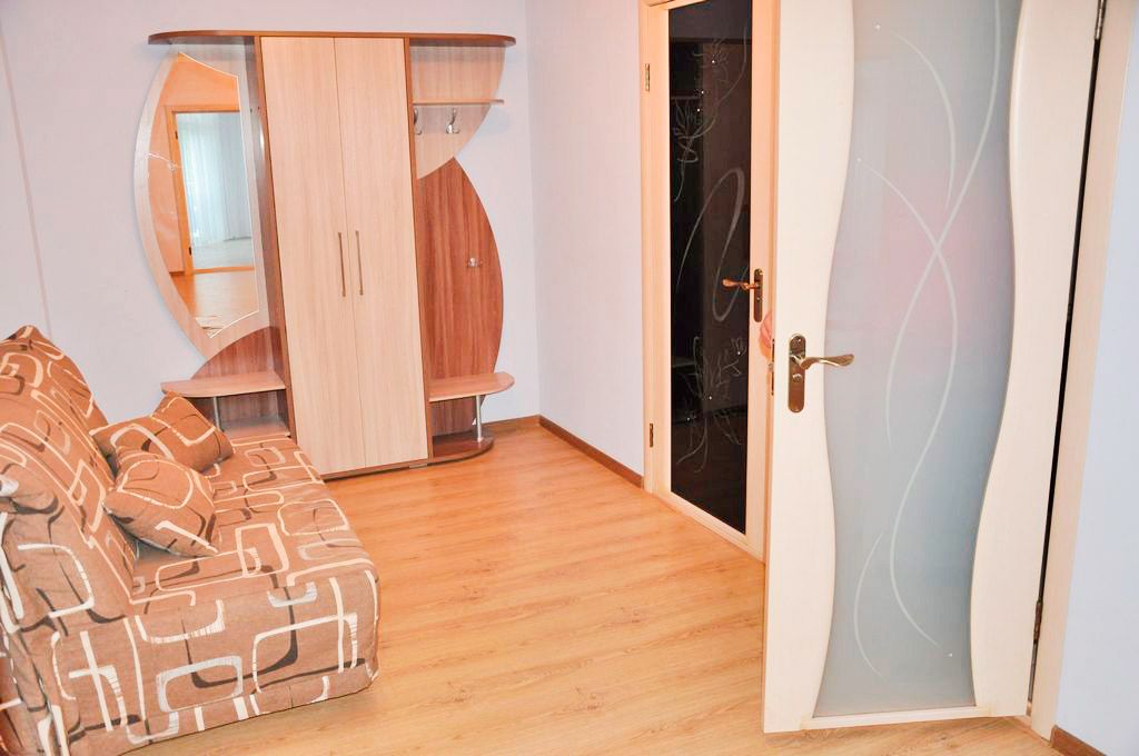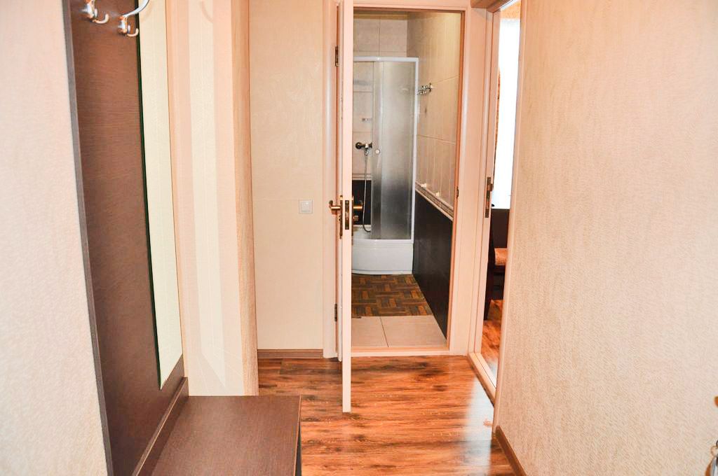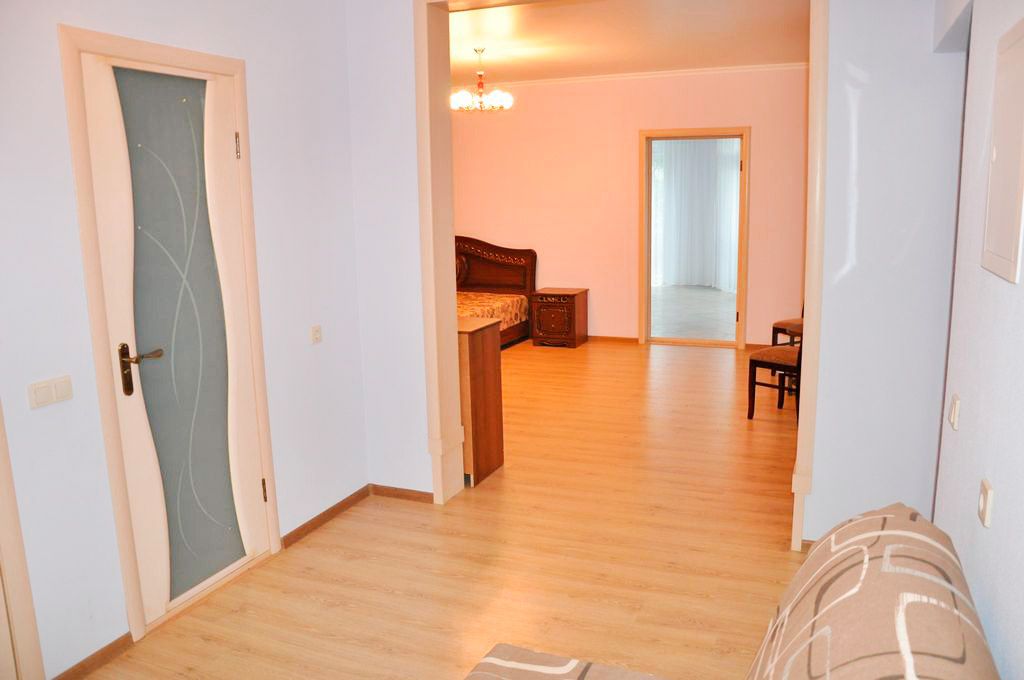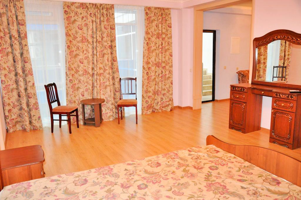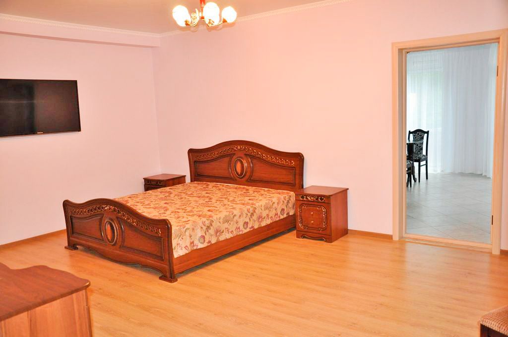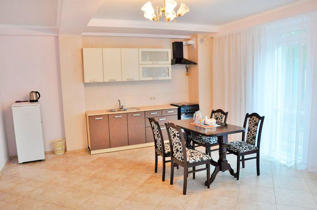 Номер оформлен в современном стиле, кровать двуспальная 180 на 200, две прикроватные тумбочки, шкаф, трюмо. Дополнительное место — диван 140 на 200,телевизор ж/к 64 диагональ, сейф, фен. Кухня полностью оборудована: холодильник, печка, микроволновка, посуда, кастрюльки, вилки, ложки, чайный набор, графин и стаканчики, электрочайник, стол со стульчиками. Ванная комната с ванной, зеркало, на каждого проживающего гостя предоставляется мыло, шампунь, туалетная бумага. По просьбе предоставляется детская кроватка.