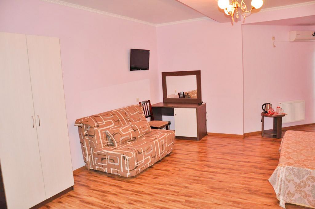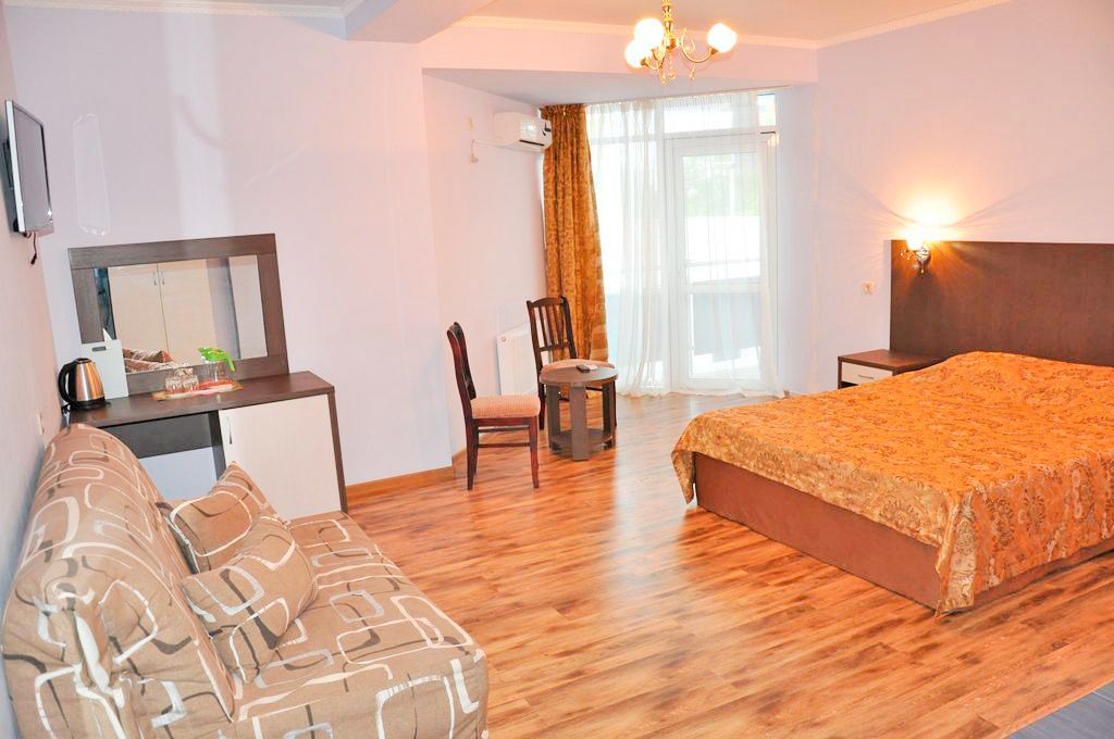 В номере: санузел (душевая кабина, раковина, фен, шампунь, мыло, туалетная бумага), кровать двуспальная 160х200 и диван 140х200, прикроватные тумбочки, светильники, сейф, телевизор ж/к, холодильник, сплит-система, принадлежности для кофе и чая, качественное постельное белье, цифровое ТВ.