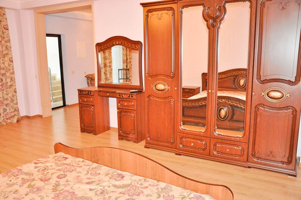 Номер оформлен в современном стиле, кровать двуспальная 180х200, две прикроватные тумбочки, шкаф, трюмо. Дополнительное место — диван 140х200, телевизор ж/к 64 диагональ, сейф, фен.