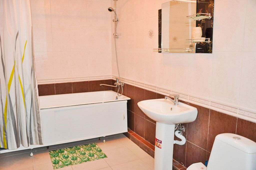 Кухня полностью оборудована: холодильник, печка, микроволновка, посуда, кастрюльки, вилки, ложки, чайный набор, графин и стаканчики, электрочайник, стол со стульчиками. Ванная комната с ванной, зеркало, на каждого проживающего гостя предоставляется мыло, шампунь, туалетная бумага.