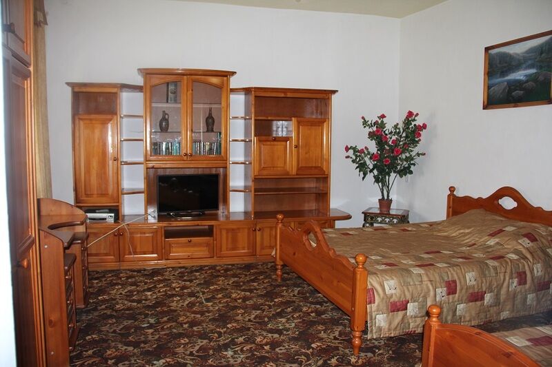 Люкс, просторный двухкомнатный номер с ковровым покрытием. В номере мебель из ангарской сосны: мебельная горка, шкафы, тумбочки, зеркало, стол, стулья; двуспальная кровать, односпальная кровать, плазменный телевизор с выходом в интернет, холодильник, кондиционер, Wi-Fi. Ванная комната: раковина, туалет, душ. Вид на сад.