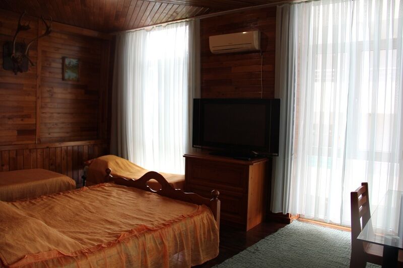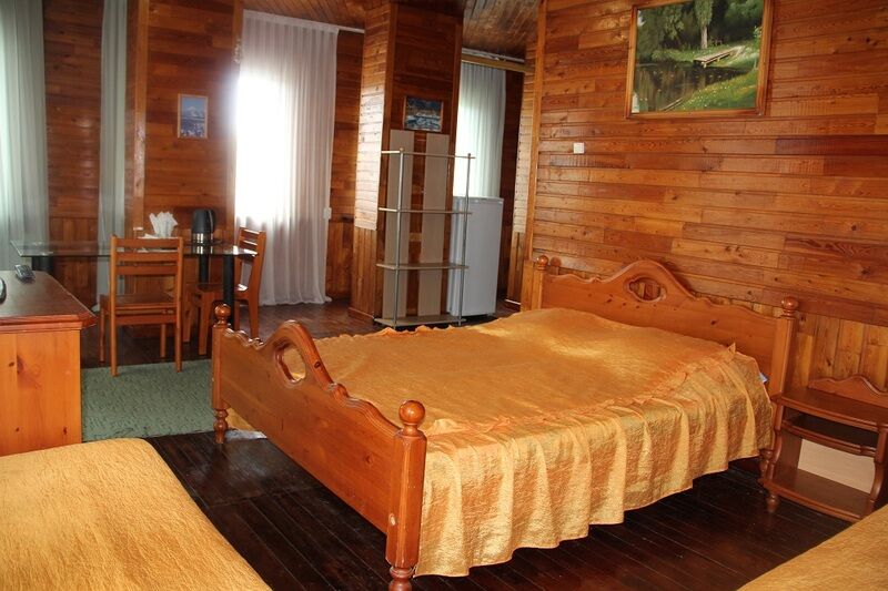 Люкс, отделанный деревом номер – студия. В номере: двуспальная кровать, три односпальные кровати, мебель из ангарской сосны: стол, стулья; телевизор, холодильник, кондиционер, Wi-Fi. Ванная комната: раковина, туалет, душ. Вид на сад.