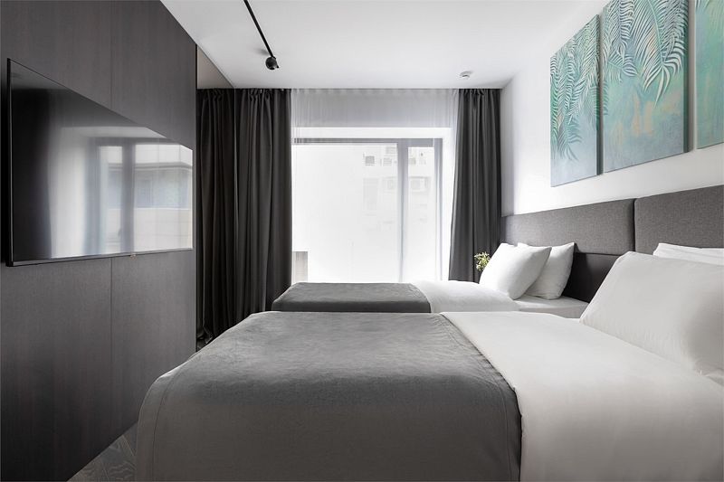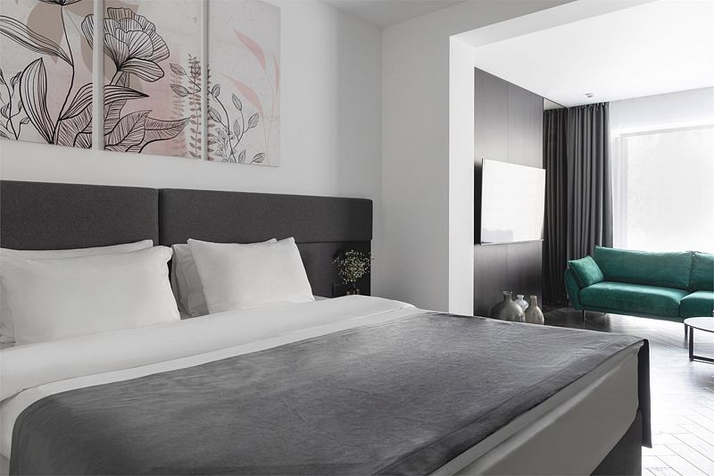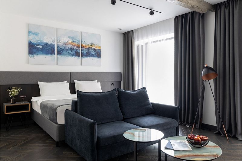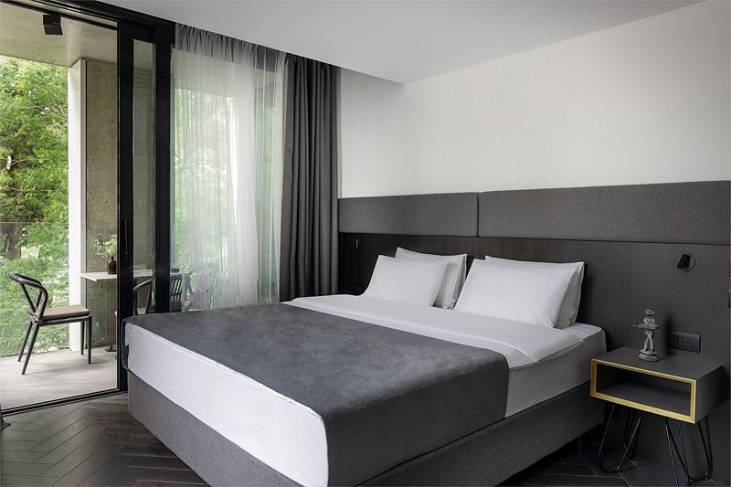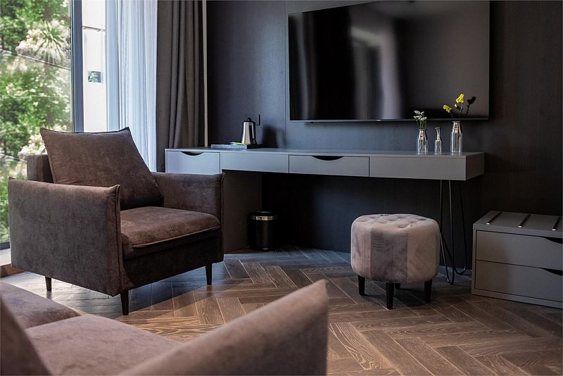 Каждый номер оборудован современной дизайнерской мебелью, санузлом с душевой кабиной, халатом, тапочками, феном, косметическими принадлежностями, телевизором, мини-холодильником, кондиционером, электрочайником, сейфом, утюгом, гладильной доской.