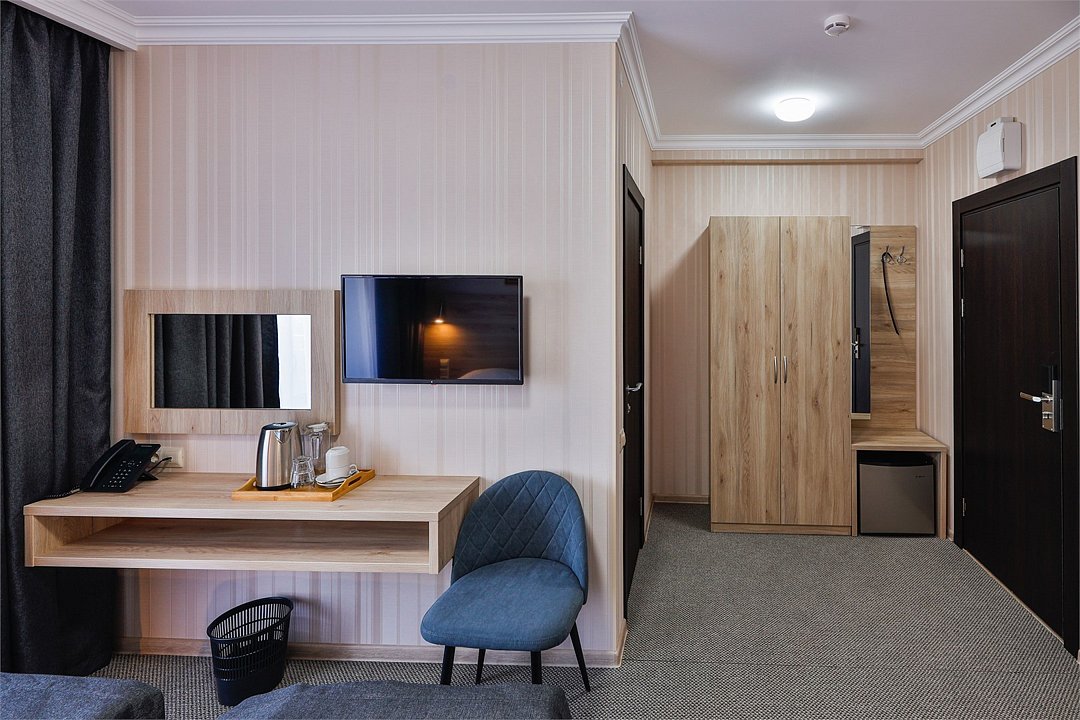 кабельное телевидение, Wi-Fi, телефон, кулер, фен, электронные замки, ванная комната, санузел, банные принадлежности, банные полотенца, гигиенические средства, балкон, две односпальные или большая двуспальная кровать, шкаф для одежды, вешалки, журнальный столик, багажная тумба, зеркало, сейф, чайник, унитаз, раковина, ковровое покрытие, отопление, кулер на этаже, туалетный столик, стул, стол, тумба, туалетный столик, туалетные средства, туалет, сплит-система, диван-кровать, раскладной диван, телевизор с плоским экраном, мини-холодильник, пуфикВ гостиничном номере