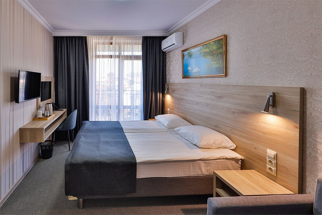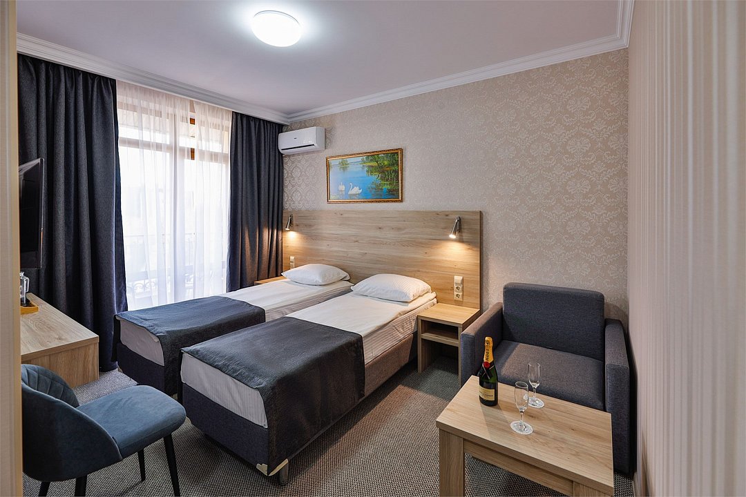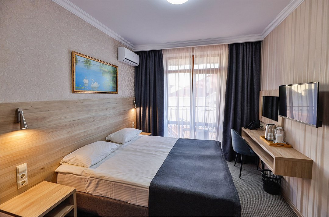 Однокомнатные номера с балконом стандартной категории с двумя односпальными или одной двуспальной кроватью и раздвижным диванчиком, расположены на 3-4 этажах .Услуги и удобства