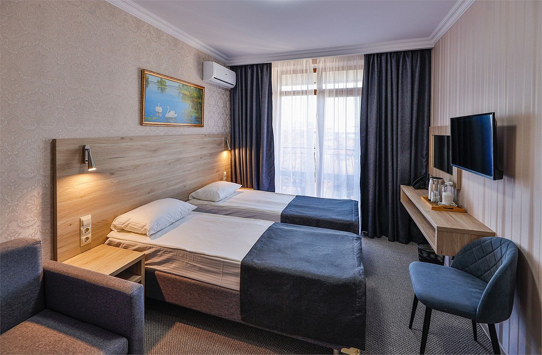 Однокомнатные номера с балконом стандартной категории с двумя односпальными или одной двуспальной кроватью и раздвижным креслом, расположены на 2-4 этажах .Услуги и удобства