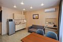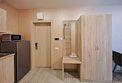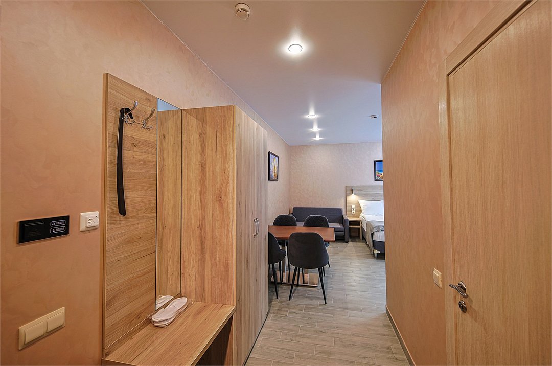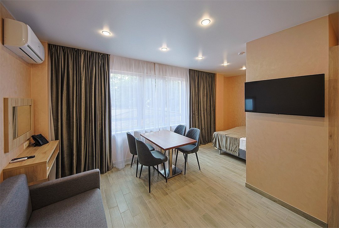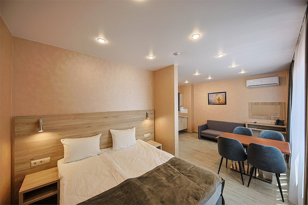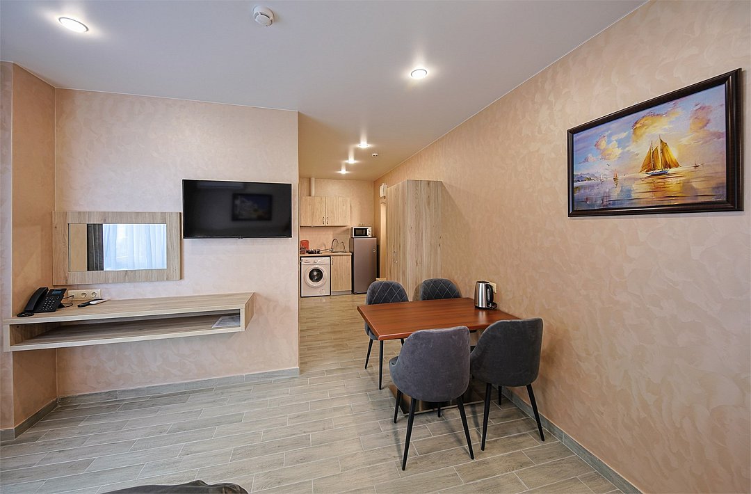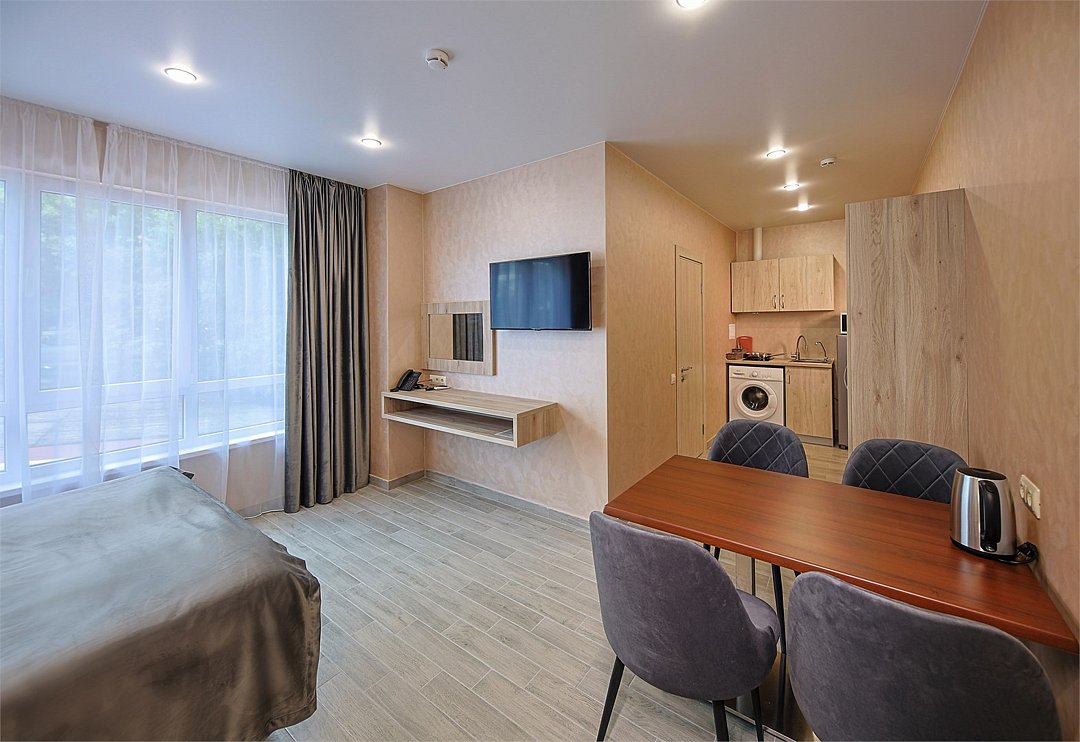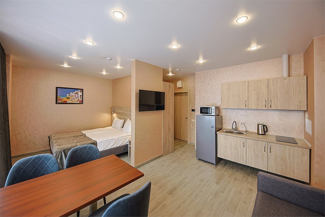 Однокомнатный номер без балкона с двуспальной кроватью и раздвижным диванчиком. Имеет зону кухни с плитой и необходимой посудой, обеденную зону, микроволновку, стиральную машину.Услуги и удобства