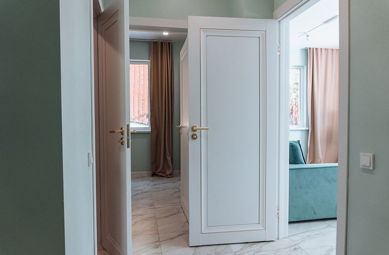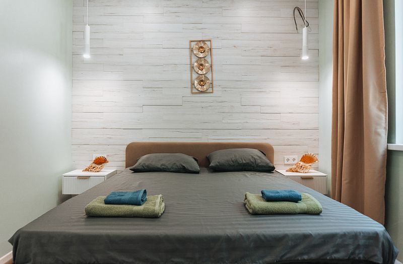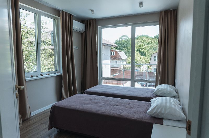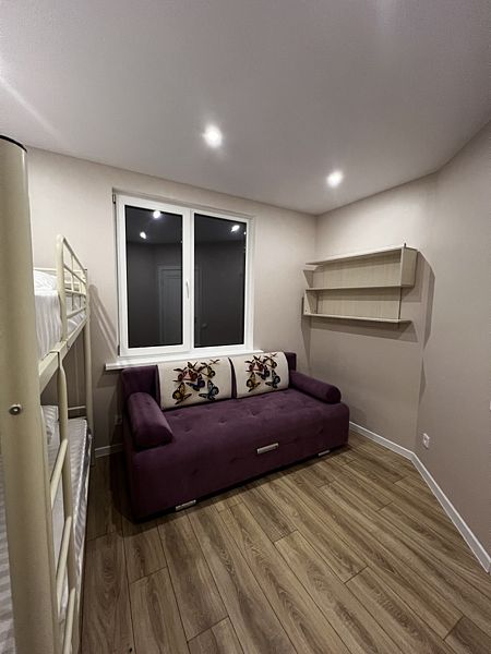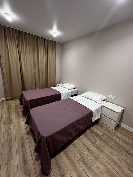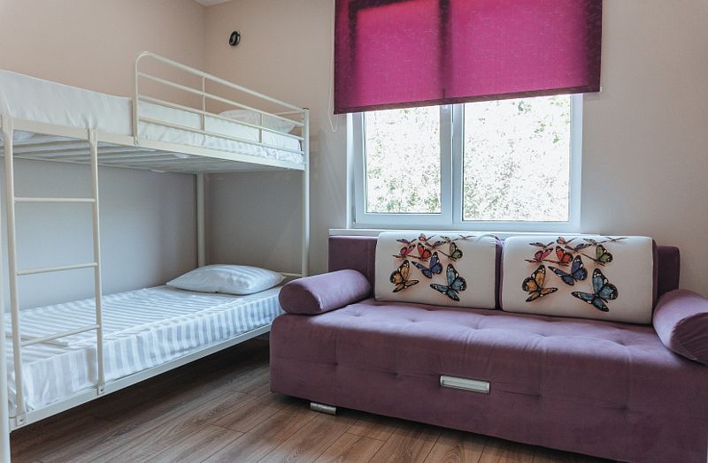 В 2 спальнях двуспальные кровати 180 и 160 см, в другой спальне 2 кровати спринг боксы, еще в другой — диван и двухъярусная кровать.