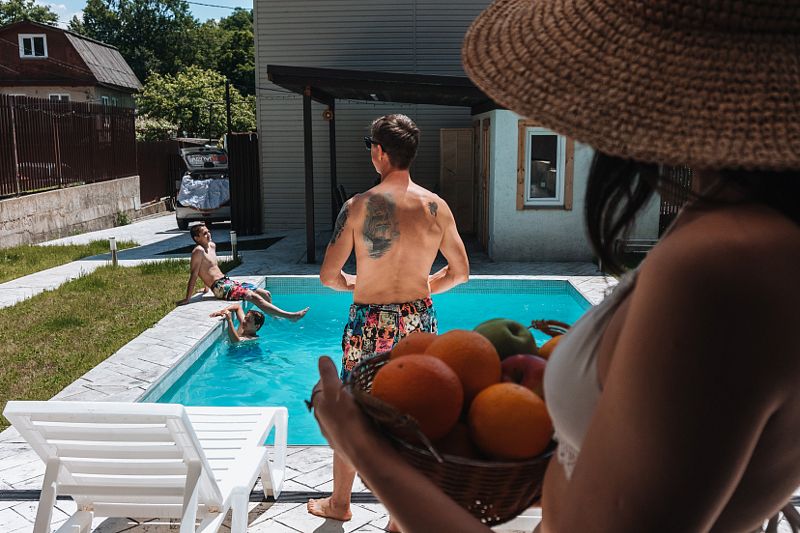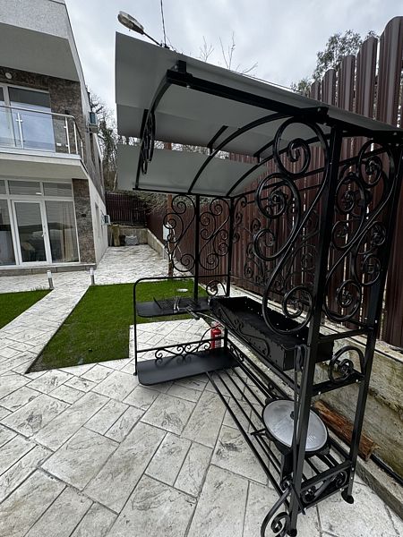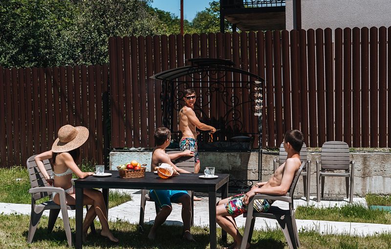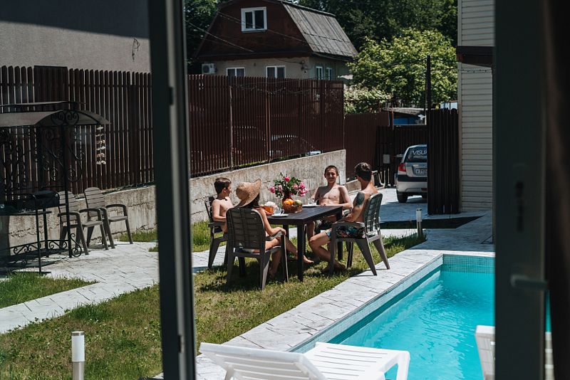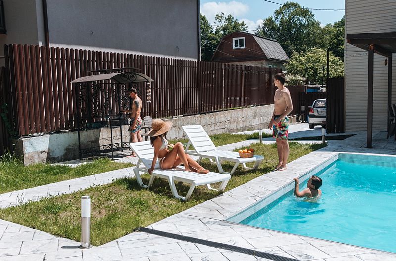 На приватной территория оборудована уютная терраса, большой теплый бассейн, сауна, лежаки, зона барбекю с необходимыми принадлежностями, а также Wi-Fi на всей территории