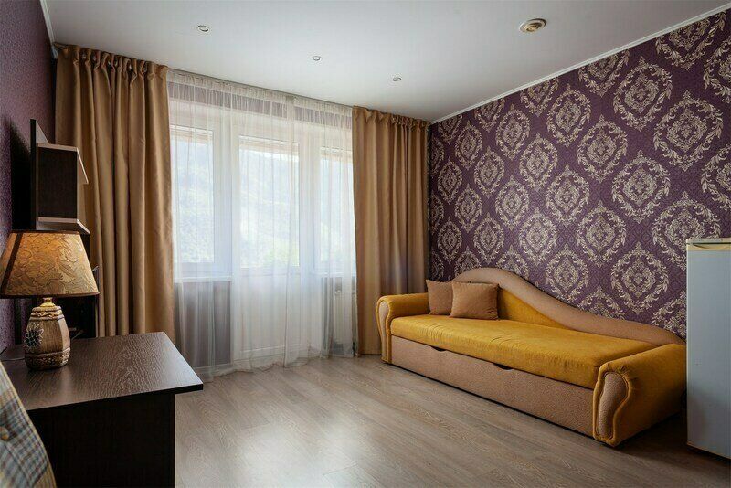 Просторный семейный номер "Люкс с видом на горы", включает в себя две комнаты, гостиную и спальную.