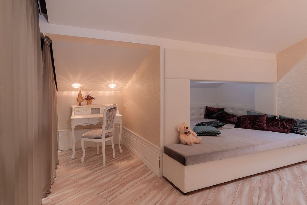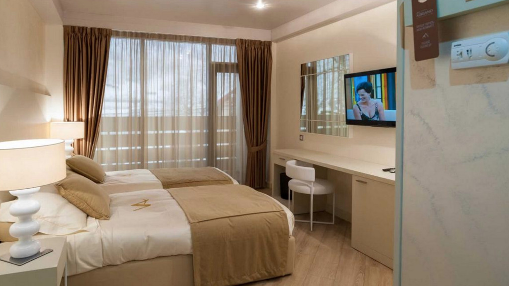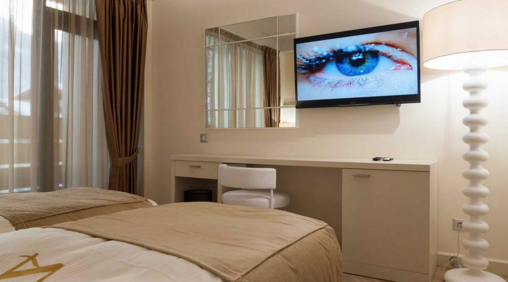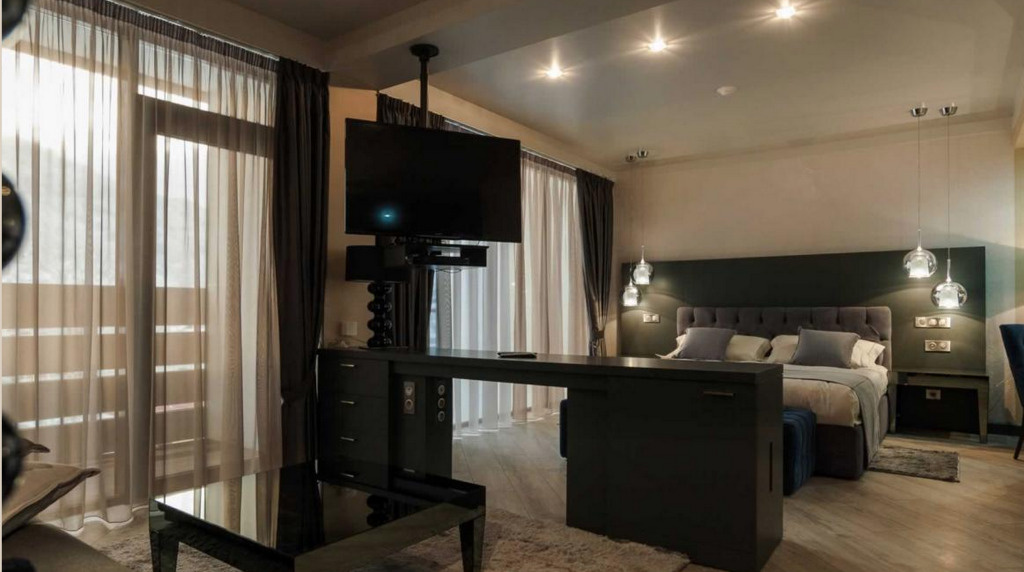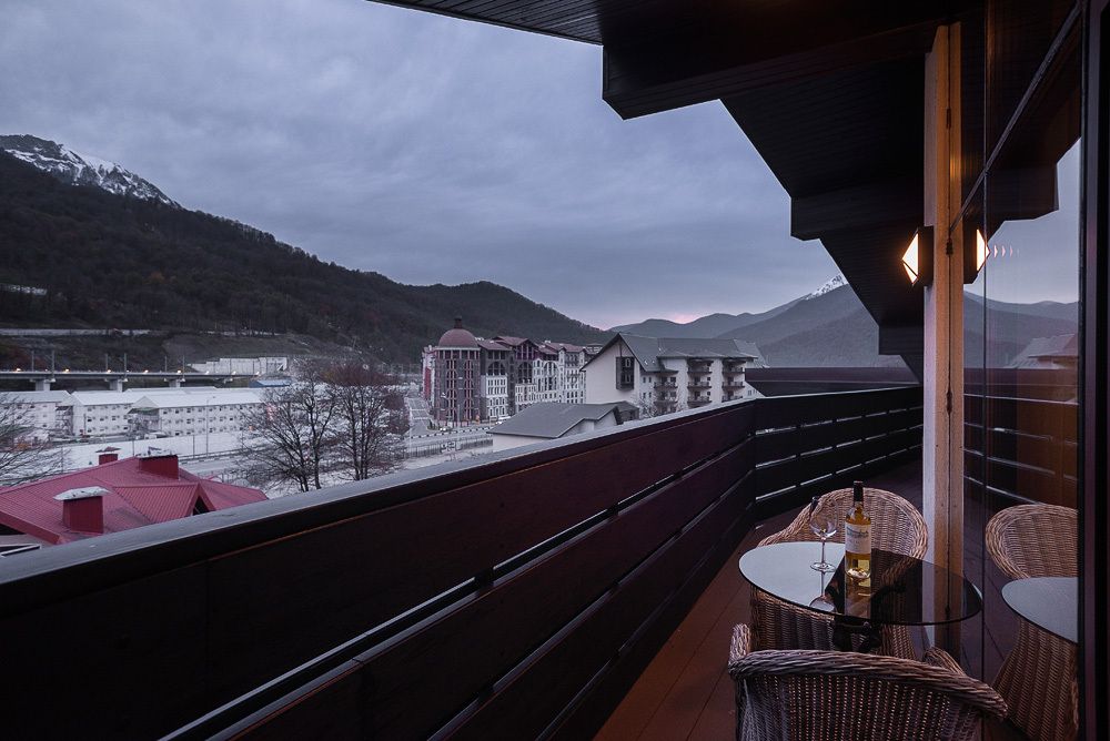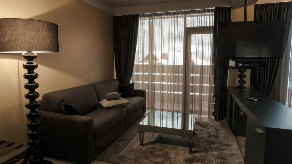 Открывается красивый вид на горы из номера . Рядом центральная улица , где есть кафе и рестораны. До подъемников 5 минут пешком. До казино минут 10