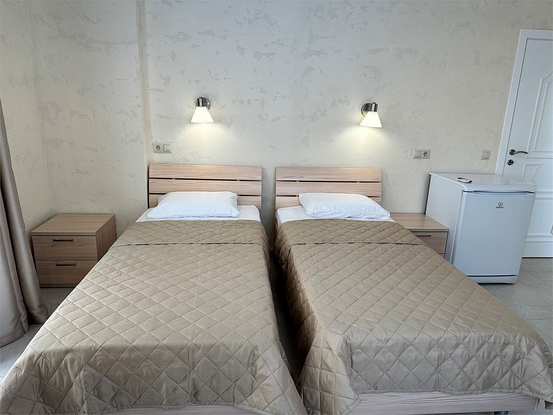 Основные места-две односпальные кровати,кресло-кровать,ТВ,кондиционер,мини-холодильник,с/у(душ+туалет)