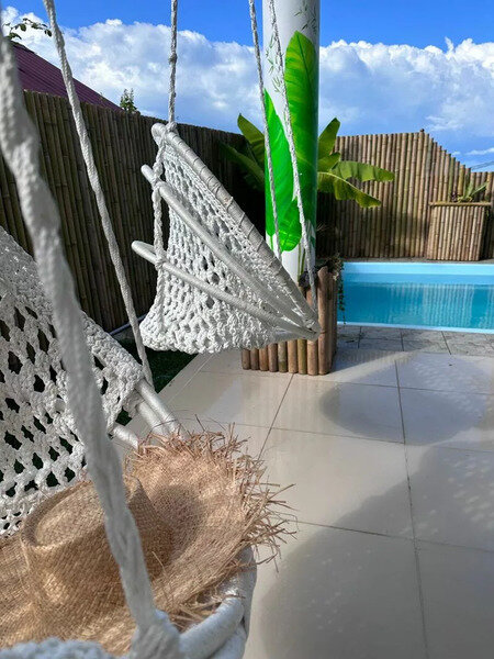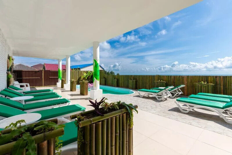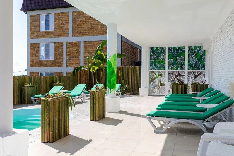 На территории работает кафе, где можно перекусить или просто отдохнуть в удобном кресле за чашечкой кофе, устроен красивый пруд, есть открытый бассейн и удобные шезлонги с матрасами по периметру.