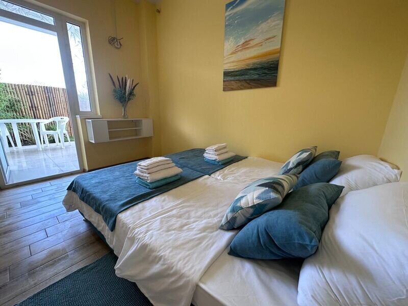 В 7–10 минутах ходьбы – широкий галечный пляж, простирающийся на несколько километров. На побережье есть раздевалки, шезлонги и зонтики.