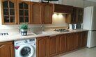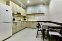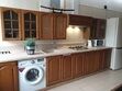 Общая кухня и коридор: холодильник, плита, микроволновая печь, стиральная машина, чайник, набор посуды, обеденный стол и стулья, большой шкаф.