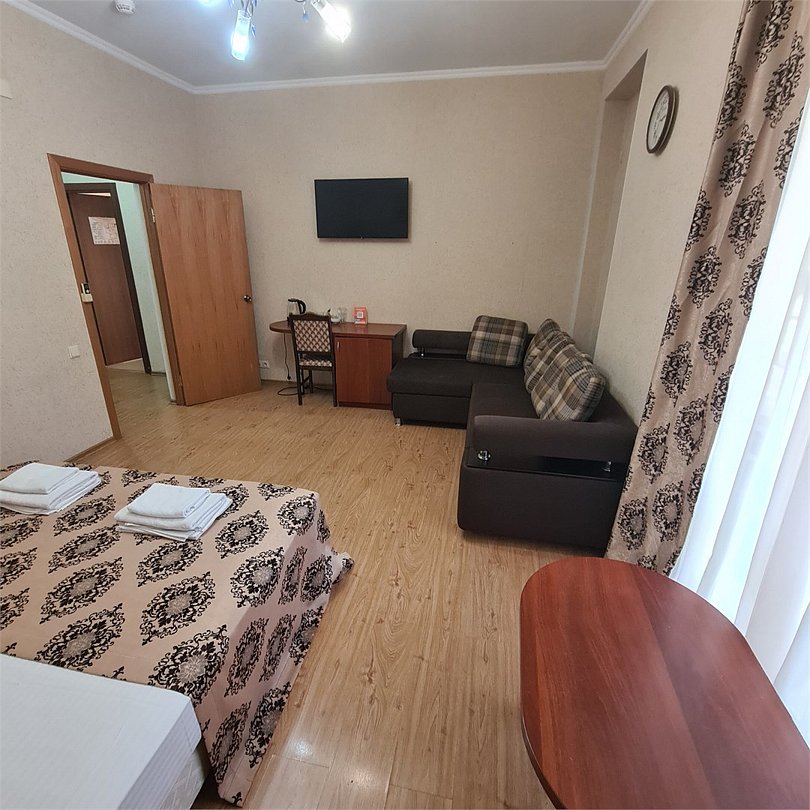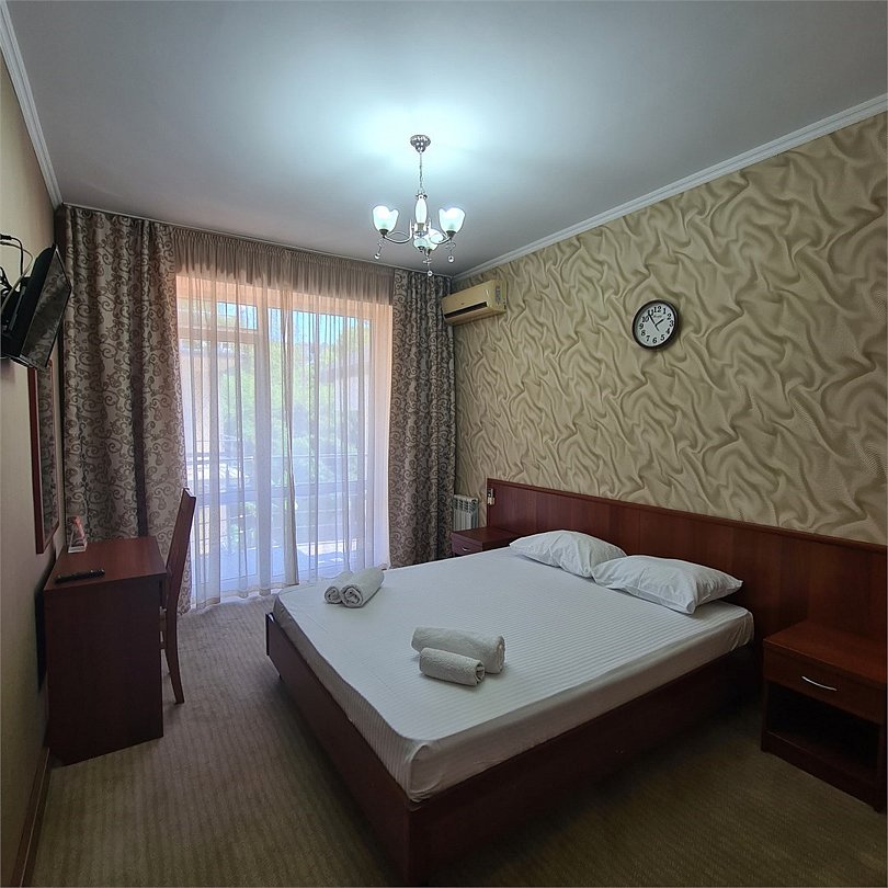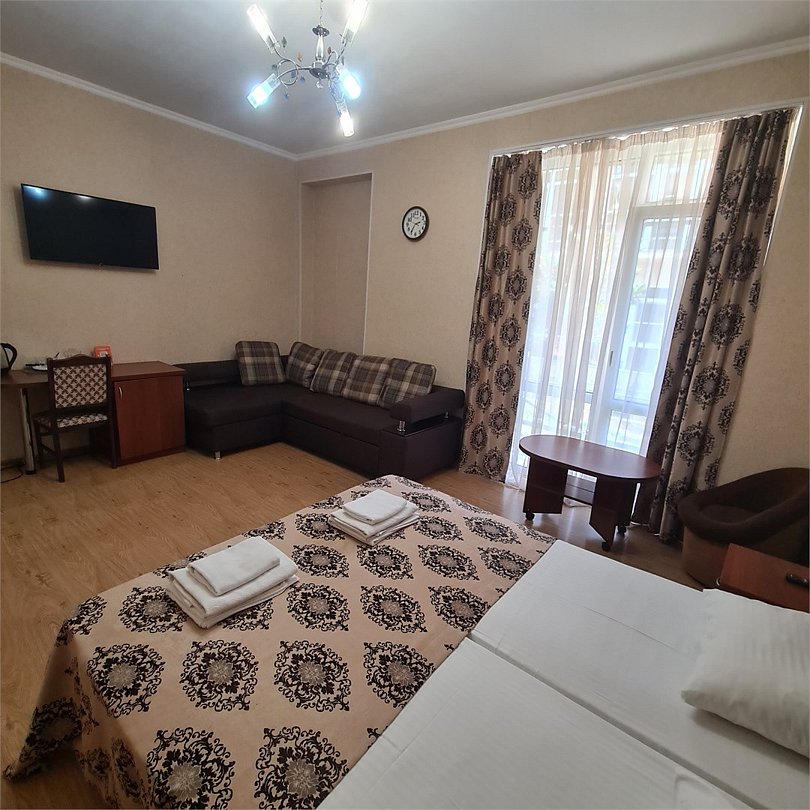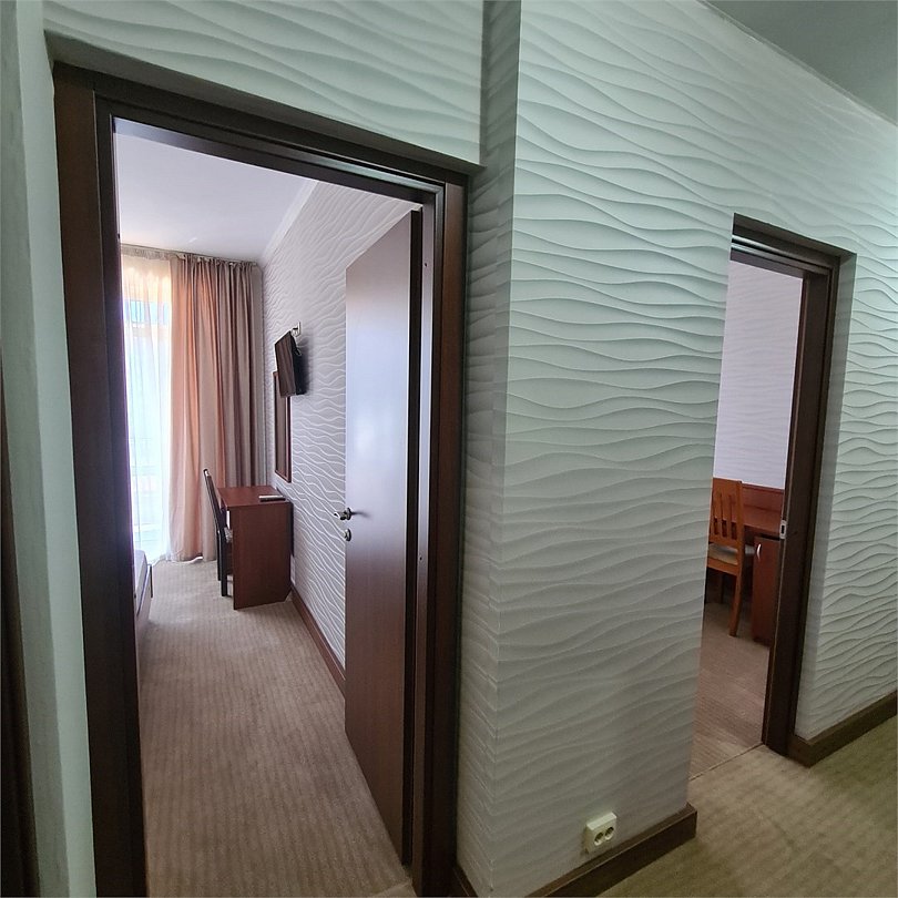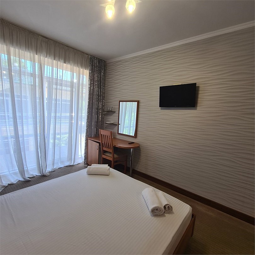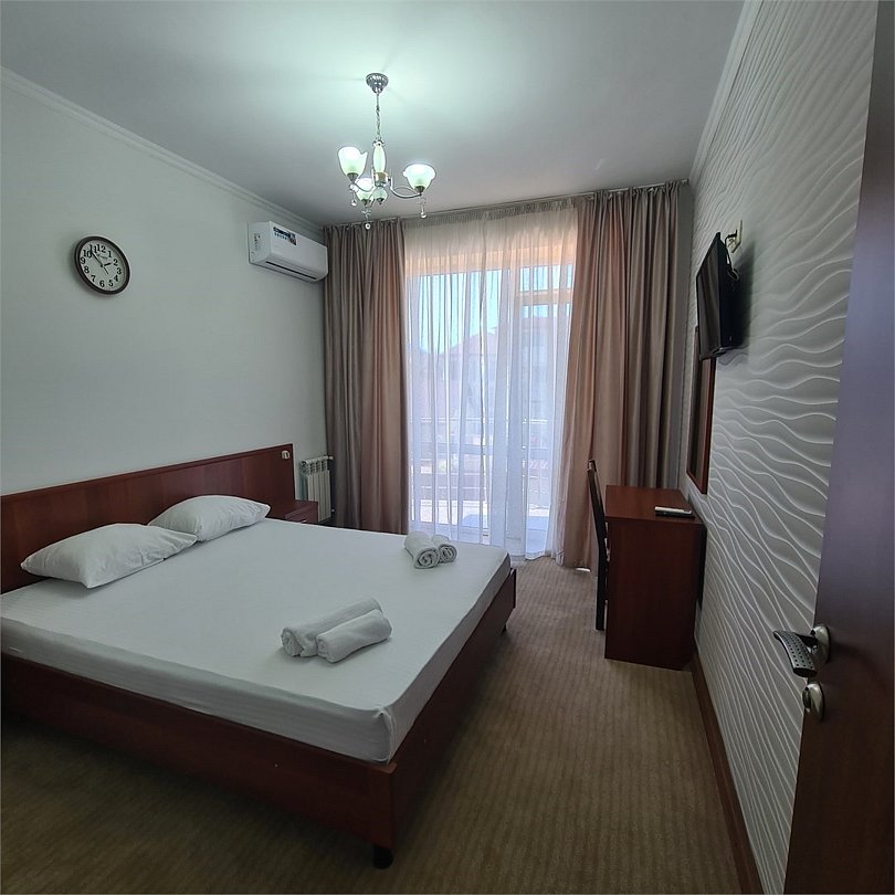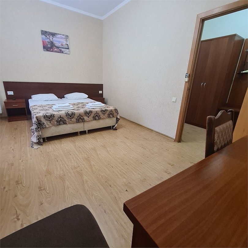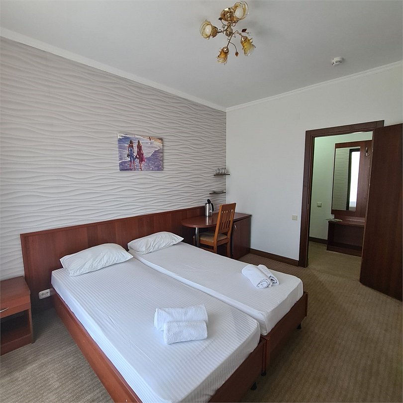 Путешествие с семьейОтличный отель!!!Редко пишу отзывы, но так понравился отдых, что решила написать. Отдыхали в этом отеле недавно, конец мая-начало июня 2022 года. Номер полулюкс с двумя комнатами. В номере две комнаты, в каждой комнате двухспальная комфортная для сна кровать, прикроватная тумба, телевизор, стол, стул, так же на номер один холодильник, wi-fi. Всё необходимое есть, ежедневно убирались и меняли полотенца. На этаже стоит кулер. Большой плюс - в отеле тихо, соседей не слышно. Перед заселение нам показали два номера на выбор, оба имели очень опрятный вид! Порадовало наличие большого балкона, накрывали там стол и сидели долгими тёплыми вечерами. Отель состоит из двух корпусов, на крыше одного из них находится бассейн и лежаки! Ещё отмечу, удачное расположение отеля! Рядом есть ВСЁ: рестораны, кафе, столовые, магазины, аптека. В шаговой доступности остановка общественного транспорта, рынок и самое главное - море!