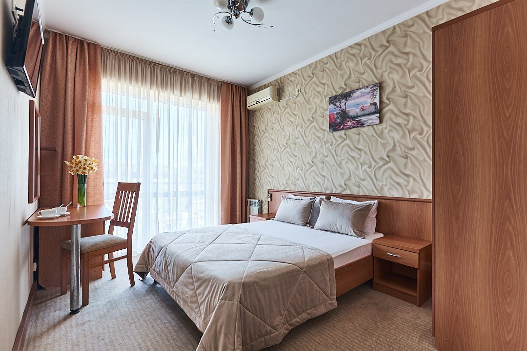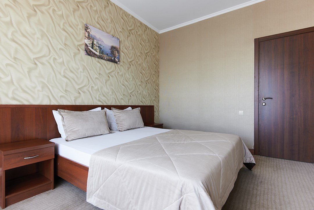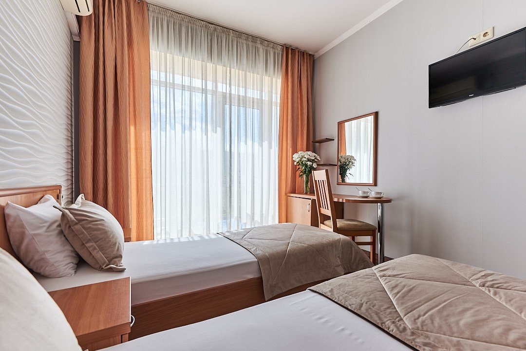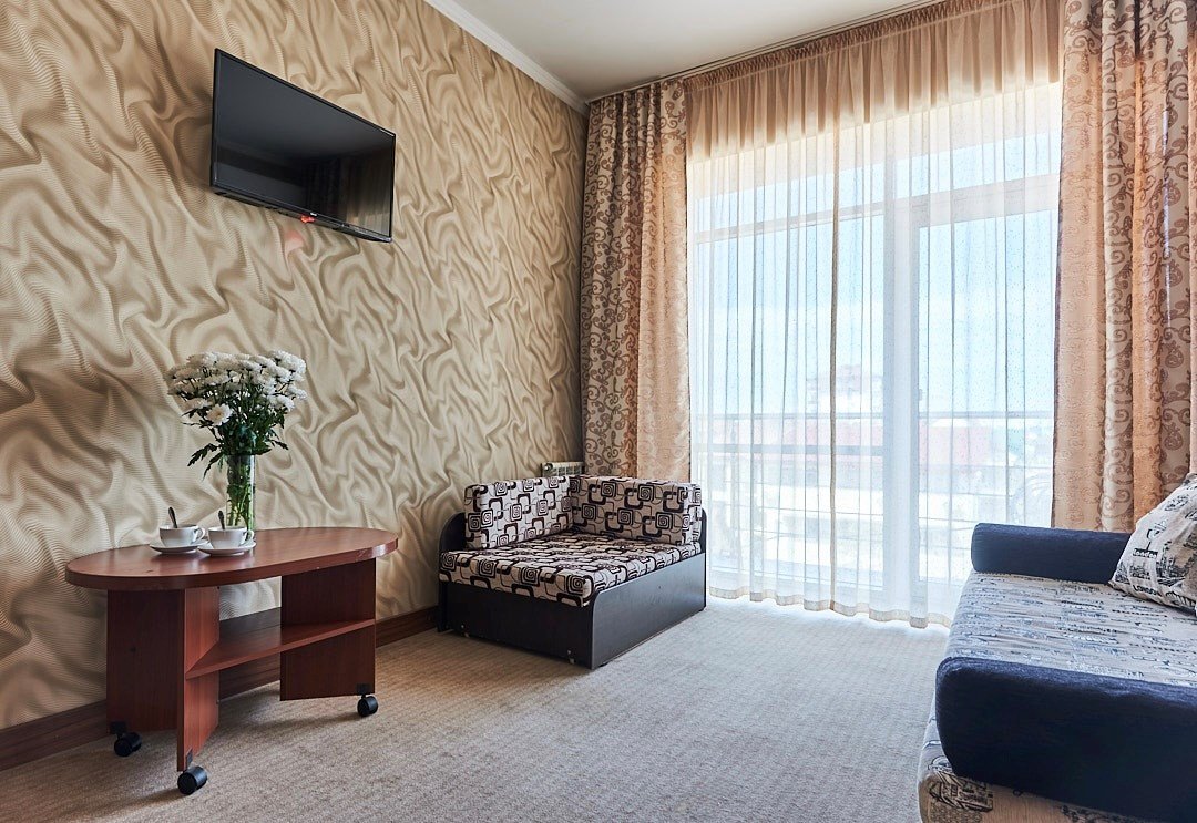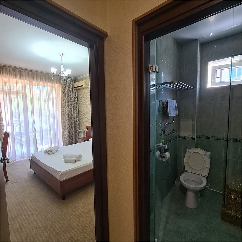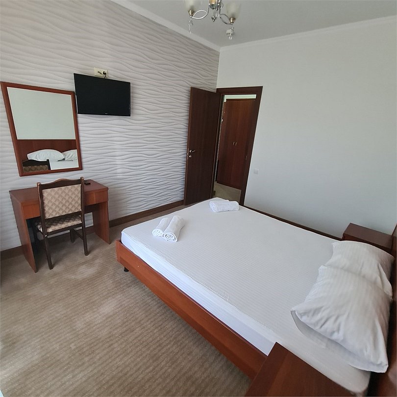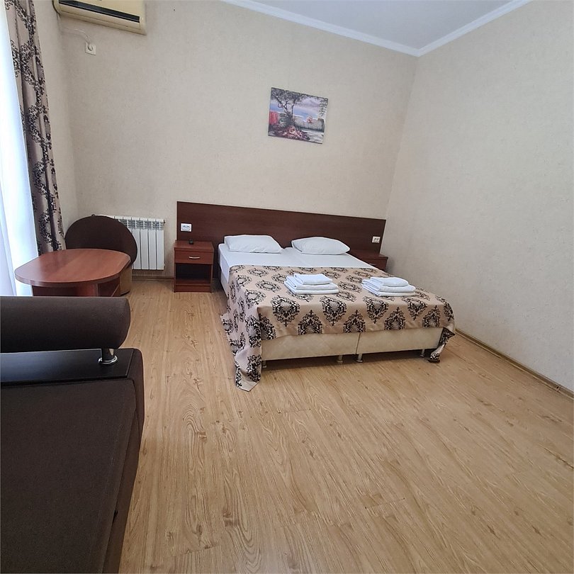 Путешествие с семьейОтличный отель!!!Редко пишу отзывы, но так понравился отдых, что решила написать. Отдыхали в этом отеле недавно, конец мая-начало июня 2022 года. Номер полулюкс с двумя комнатами. В номере две комнаты, в каждой комнате двухспальная комфортная для сна кровать, прикроватная тумба, телевизор, стол, стул, так же на номер один холодильник, wi-fi. Всё необходимое есть, ежедневно убирались и меняли полотенца. На этаже стоит кулер. Большой плюс - в отеле тихо, соседей не слышно. Перед заселение нам показали два номера на выбор, оба имели очень опрятный вид! Порадовало наличие большого балкона, накрывали там стол и сидели долгими тёплыми вечерами. Отель состоит из двух корпусов, на крыше одного из них находится бассейн и лежаки! Ещё отмечу, удачное расположение отеля! Рядом есть ВСЁ: рестораны, кафе, столовые, магазины, аптека. В шаговой доступности остановка общественного транспорта, рынок и самое главное - море!