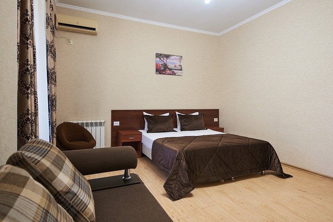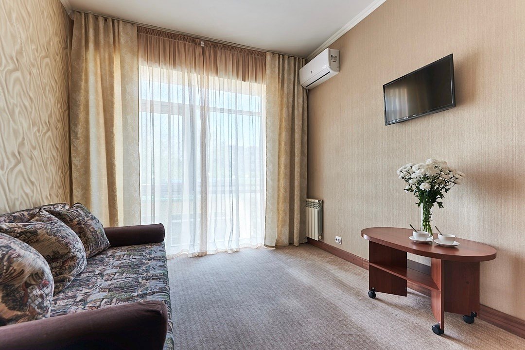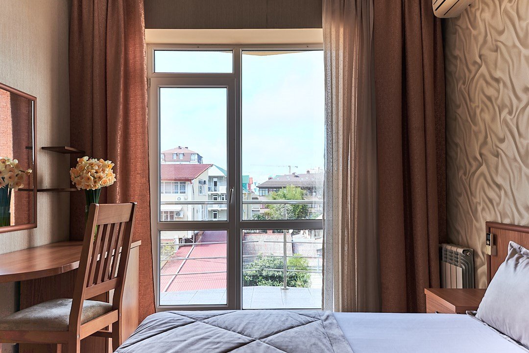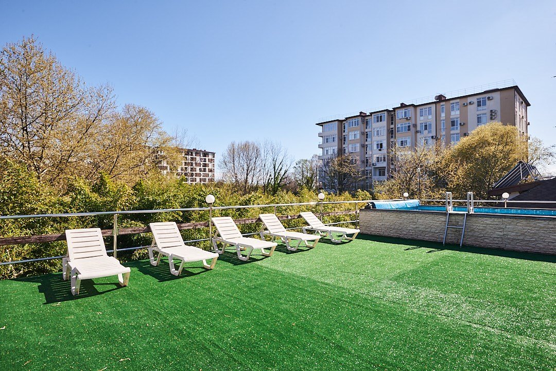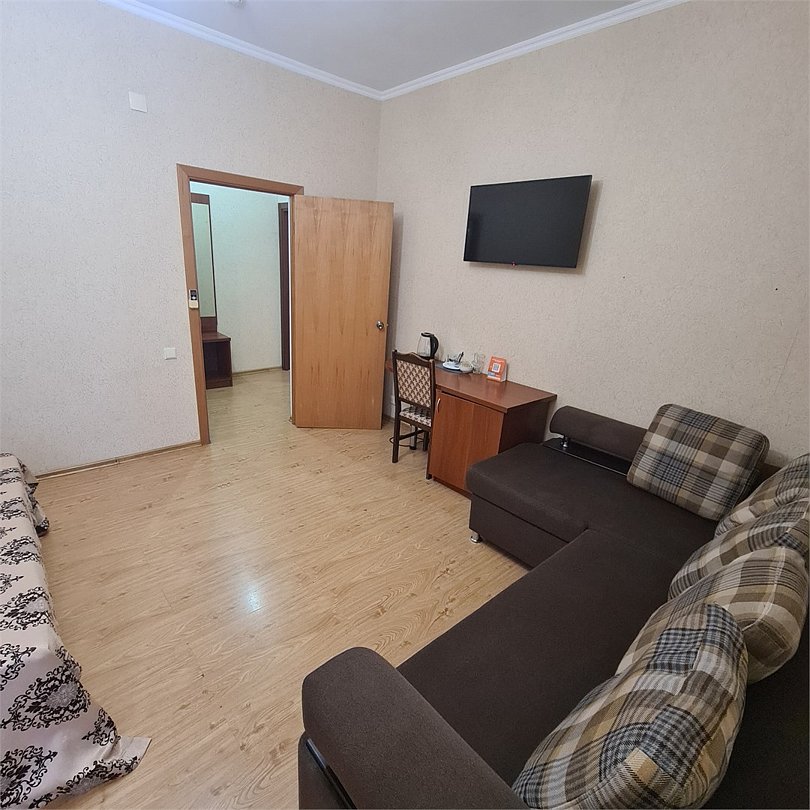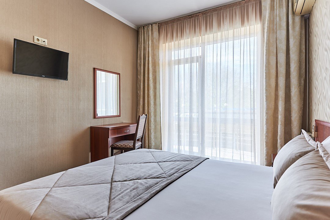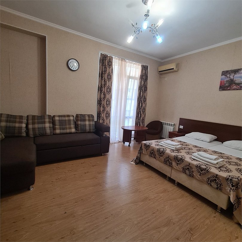 Путешествие с семьейОтличный отель!!!Редко пишу отзывы, но так понравился отдых, что решила написать. Отдыхали в этом отеле недавно, конец мая-начало июня 2022 года. Номер полулюкс с двумя комнатами. В номере две комнаты, в каждой комнате двухспальная комфортная для сна кровать, прикроватная тумба, телевизор, стол, стул, так же на номер один холодильник, wi-fi. Всё необходимое есть, ежедневно убирались и меняли полотенца. На этаже стоит кулер. Большой плюс - в отеле тихо, соседей не слышно. Перед заселение нам показали два номера на выбор, оба имели очень опрятный вид! Порадовало наличие большого балкона, накрывали там стол и сидели долгими тёплыми вечерами. Отель состоит из двух корпусов, на крыше одного из них находится бассейн и лежаки! Ещё отмечу, удачное расположение отеля! Рядом есть ВСЁ: рестораны, кафе, столовые, магазины, аптека. В шаговой доступности остановка общественного транспорта, рынок и самое главное - море!