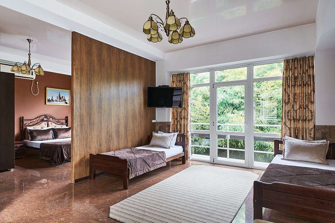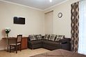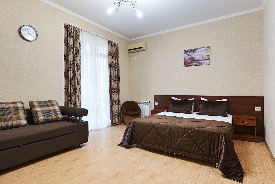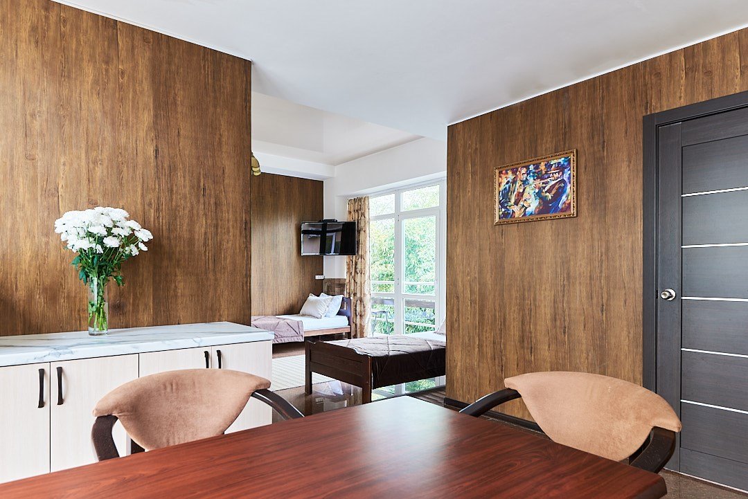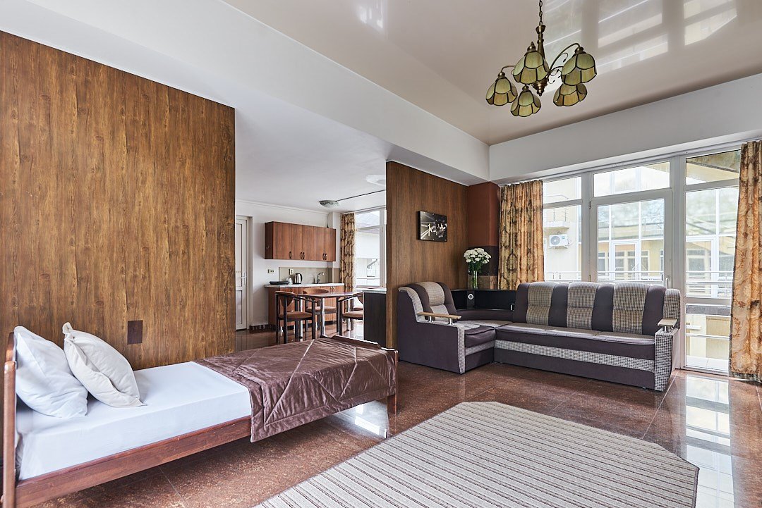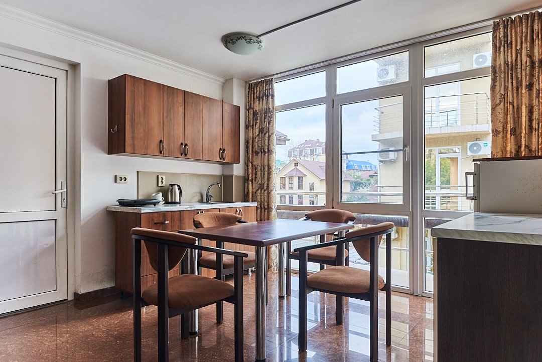 Апартаменты с кухней - номер с одной двуспальной кроватью, двумя односпальными кроватями и двуспальным диваном. С комфортом можно разместиться семье из шести человек. Без доплаты возможно размещение одного ребенка возрастом до 4 лет включительно при размещении на спальном месте с родителями. Есть сплит система и доступ к сети Wi-Fi. В апартаментах есть все необходимое для полноценного отдыха. Для удобства гостей есть собственная кухонная зона, оснащенная мойкой, электроплитой, микроволновой печью, холодильником, электрочайником, необходимым набором посуды, обеденным столом со стульями. Так же имеется телевизор, фен, шкаф для одежды. Имеется собственный санузел с душем. В санузле косметические принадлежности: мыло, шампунь, гель для душа, туалетная бумага, комплект полотенец (для ног, лицевые и банные).Услуги и удобства