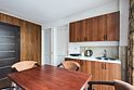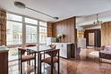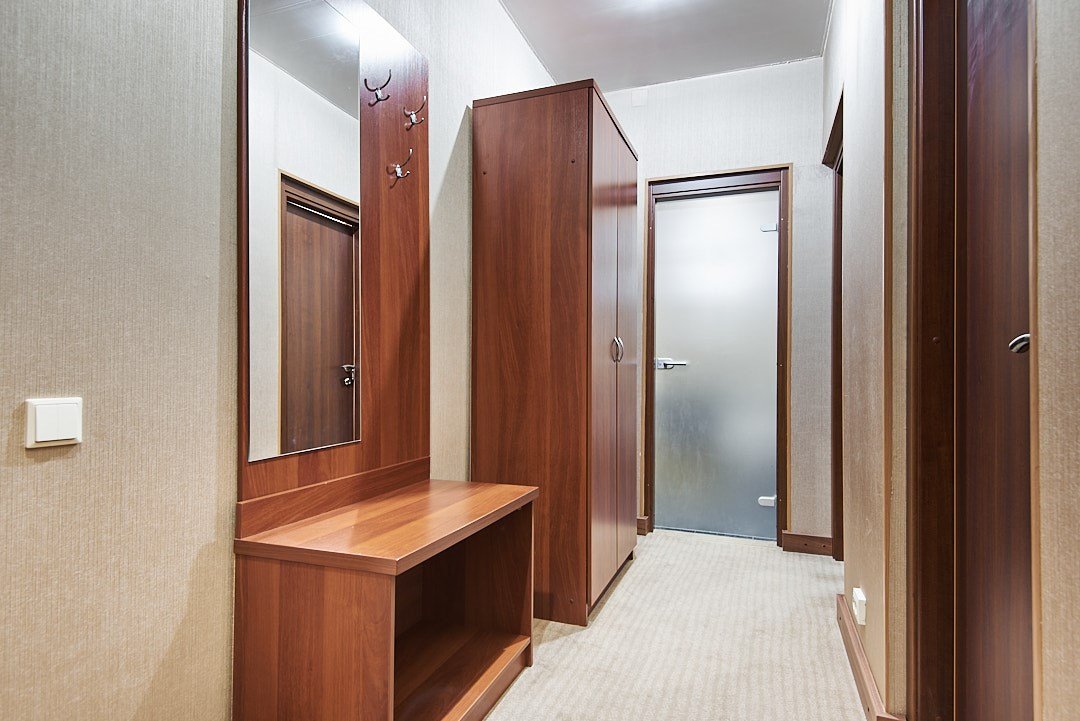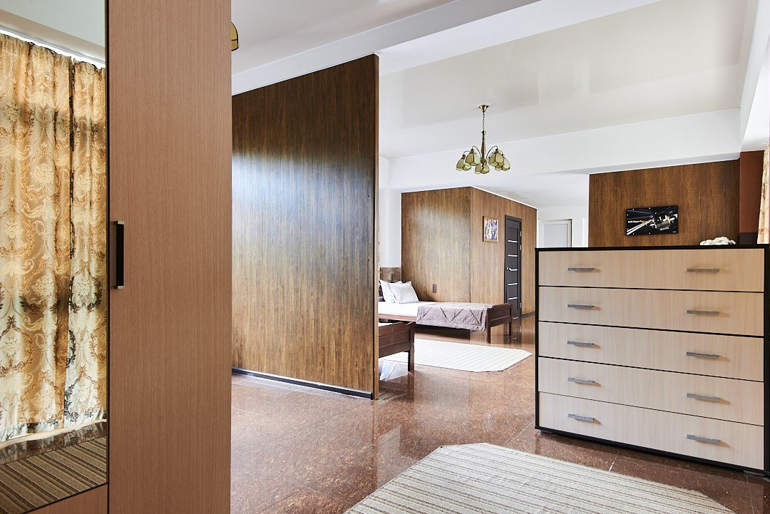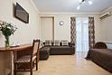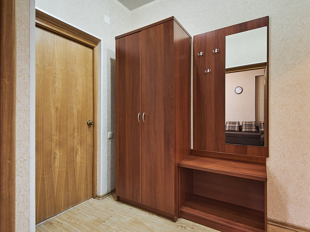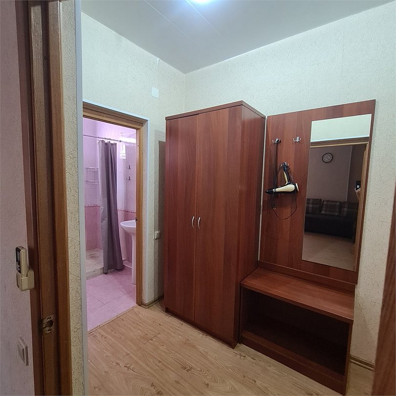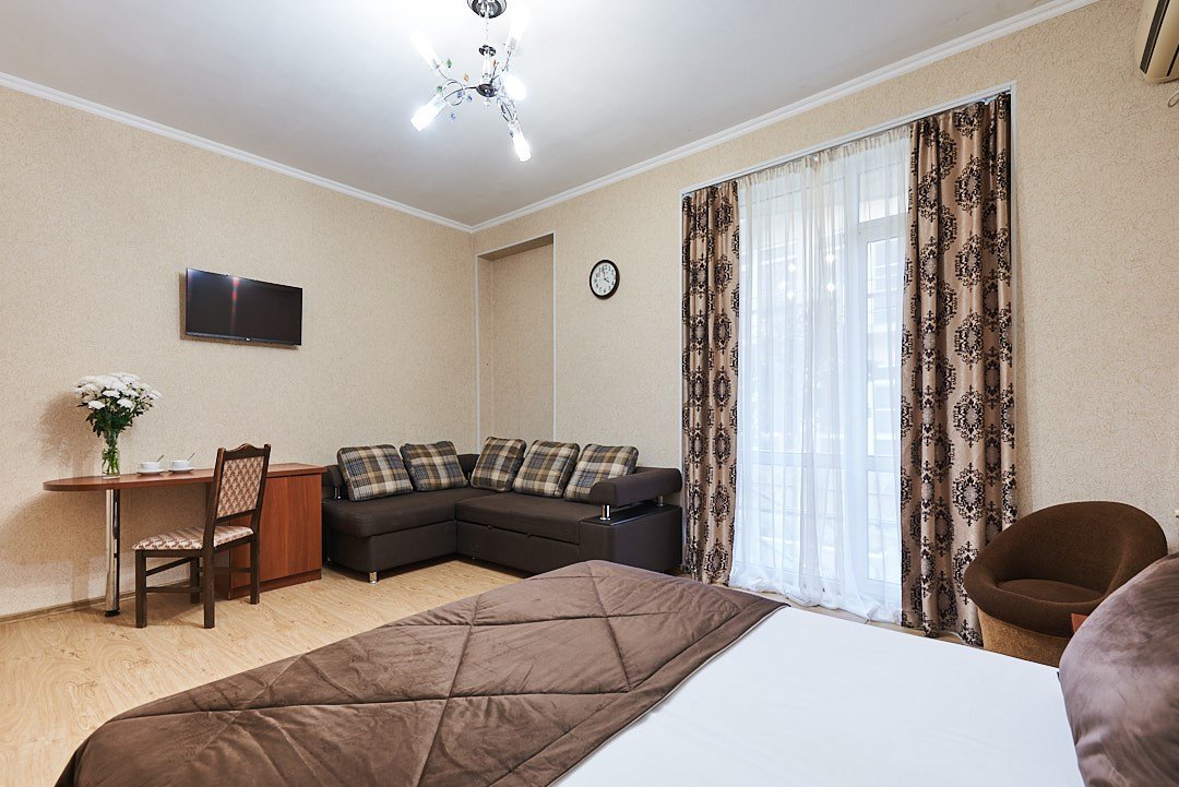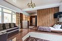 Апартаменты с кухней - номер с одной двуспальной кроватью, двумя односпальными кроватями и двуспальным диваном. С комфортом можно разместиться семье из шести человек. Без доплаты возможно размещение одного ребенка возрастом до 4 лет включительно при размещении на спальном месте с родителями. Есть сплит система и доступ к сети Wi-Fi. В апартаментах есть все необходимое для полноценного отдыха. Для удобства гостей есть собственная кухонная зона, оснащенная мойкой, электроплитой, микроволновой печью, холодильником, электрочайником, необходимым набором посуды, обеденным столом со стульями. Так же имеется телевизор, фен, шкаф для одежды. Имеется собственный санузел с душем. В санузле косметические принадлежности: мыло, шампунь, гель для душа, туалетная бумага, комплект полотенец (для ног, лицевые и банные).Услуги и удобства