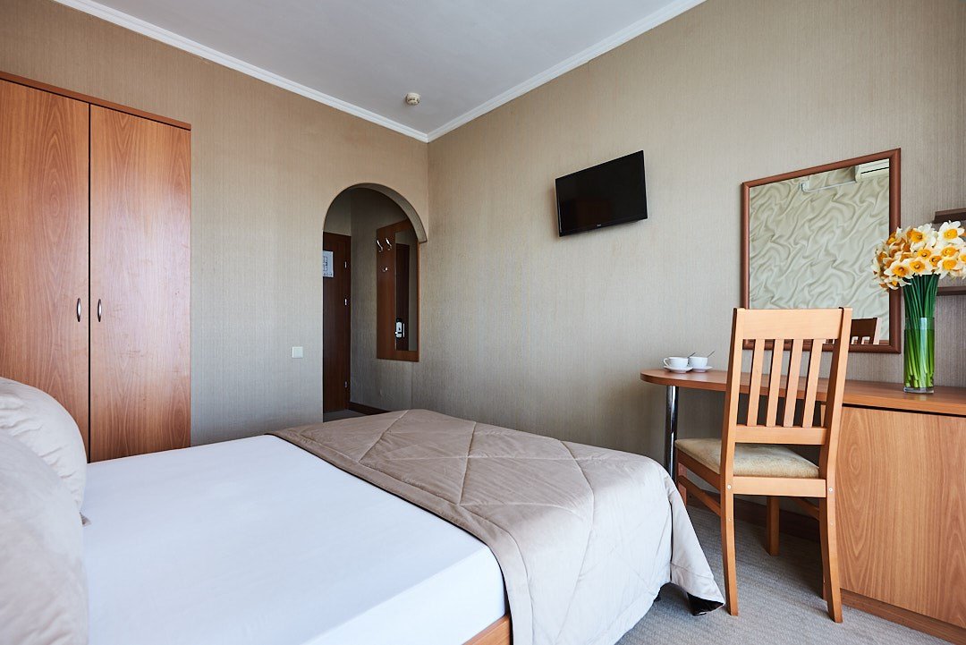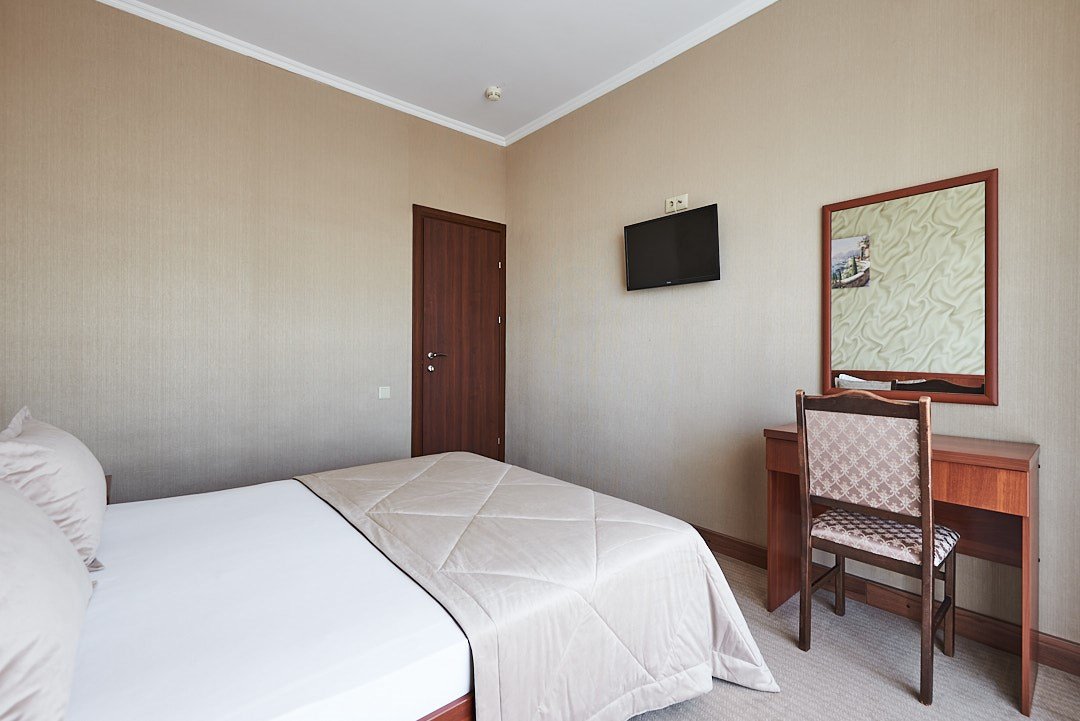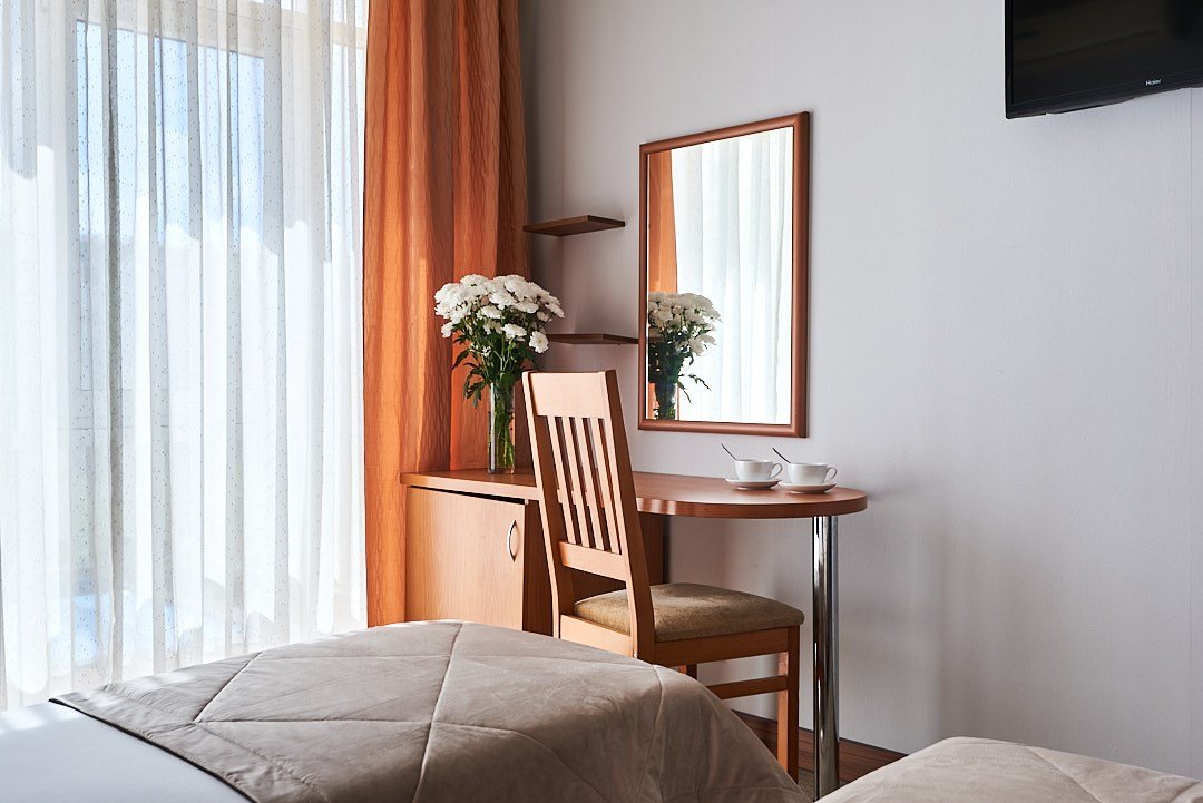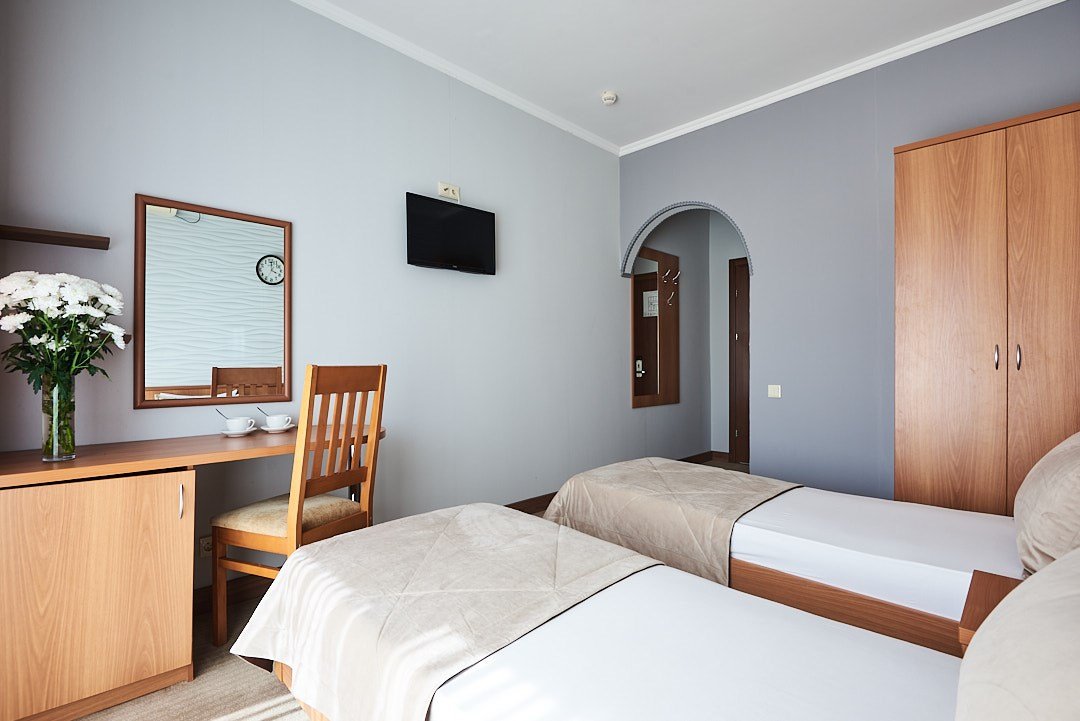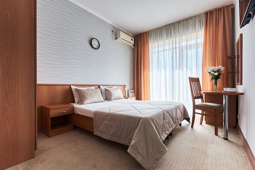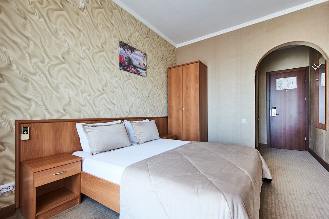Стандарт двухместный без балкона – номер с одной двуспальной или двумя раздельными кроватями. В номере имеется холодильник, телевизор, кондиционер сплит-система, фен, журнальный столик, бокалы. В номере собственный санузел, в котором установлен душ. Номера комплектуются набором полотенец на каждого гостя (банное, лицевое и полотенце для ног). В ванной комнате есть жидкое мыло. В номере без предоставления дополнительного места и без дополнительной оплаты может проживать ребенок в возрасте до 4 лет (2+1).Услуги и удобства