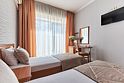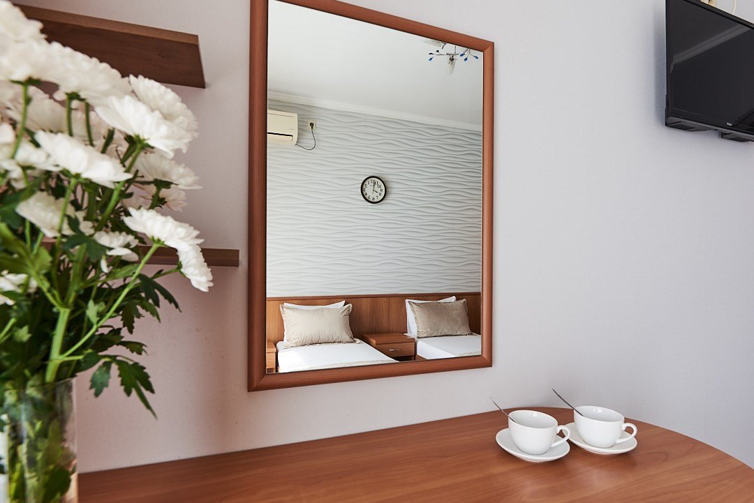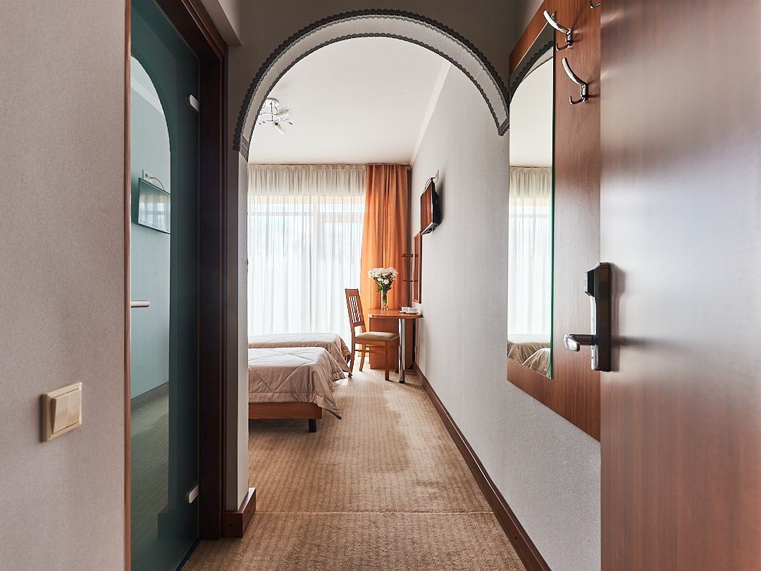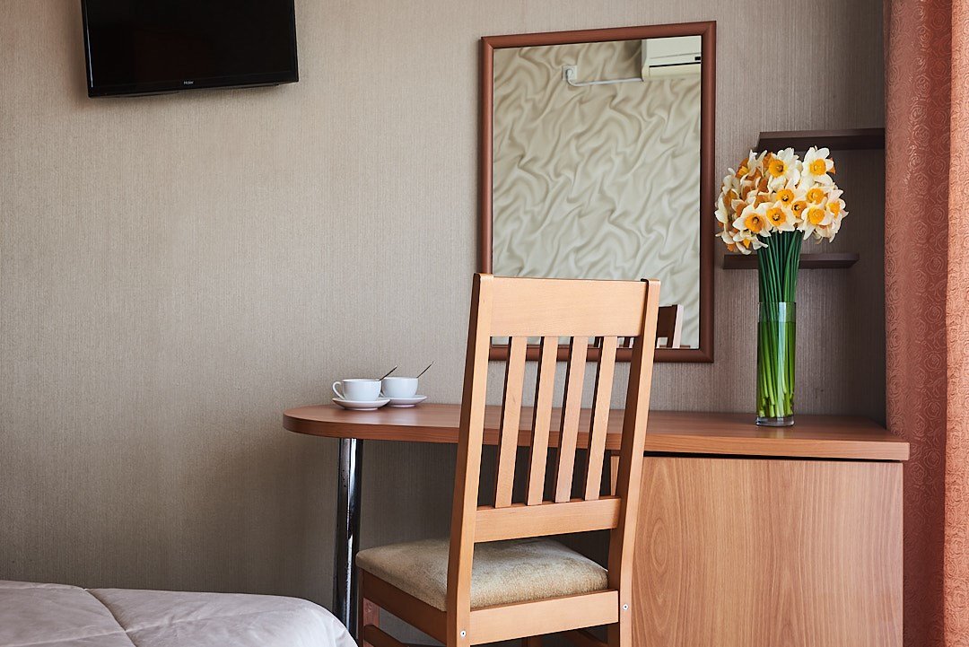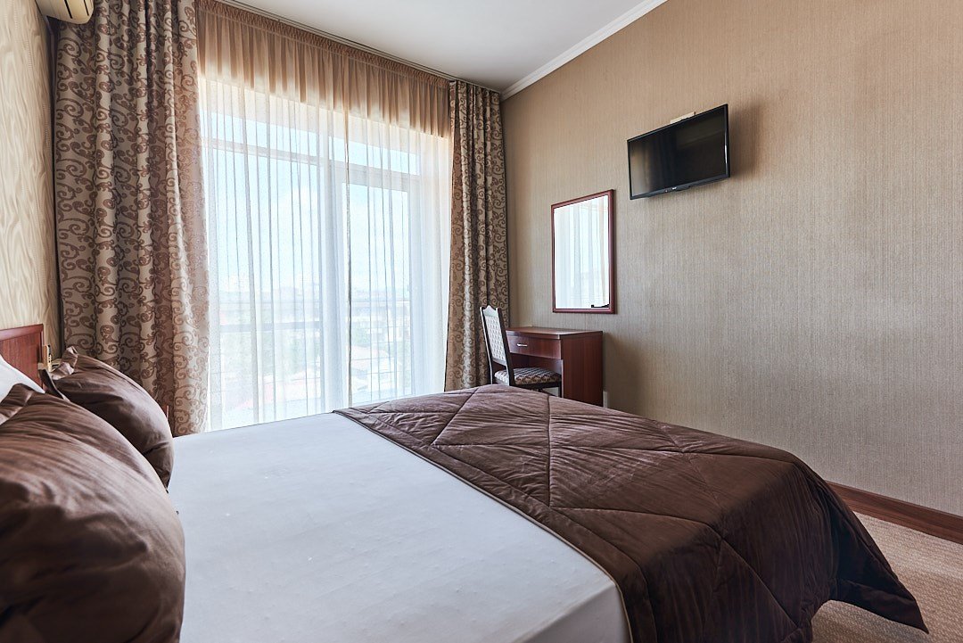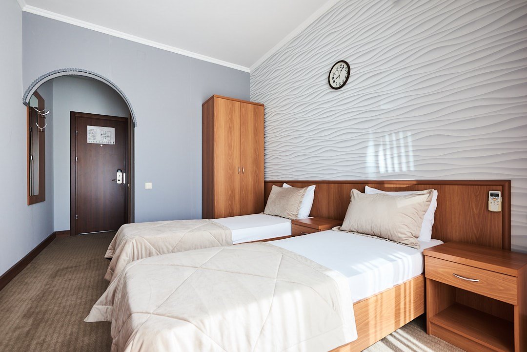 Стандарт двухместный без балкона – номер с одной двуспальной или двумя раздельными кроватями. В номере имеется холодильник, телевизор, кондиционер сплит-система, фен, журнальный столик, бокалы. В номере собственный санузел, в котором установлен душ. Номера комплектуются набором полотенец на каждого гостя (банное, лицевое и полотенце для ног). В ванной комнате есть жидкое мыло. В номере без предоставления дополнительного места и без дополнительной оплаты может проживать ребенок в возрасте до 4 лет (2+1).Услуги и удобства