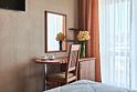 Комфорт двухместный с балконом – номер с одной двуспальной кроватью. В номере имеется холодильник, телевизор, кондиционер сплит-система, фен, журнальный столик, бокалы. В номере собственный санузел, в котором установлен душ. Номера комплектуются набором полотенец на каждого гостя (банное, лицевое и полотенце для ног). В ванной комнате есть жидкое мыло. В номере есть балкон. В номере без предоставления дополнительного места и без дополнительной оплаты может проживать ребенок в возрасте до 4 лет (2+1).Услуги и удобства