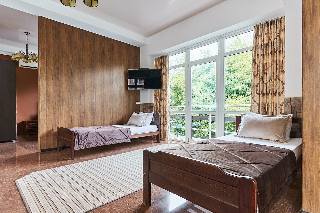 Wi-Fi, кондиционер, светильник, фен, санузел, банные полотенца, две односпальные кровати, диван, тумбы, шкаф для одежды, вешалки, журнальный столик, письменный стол, багажная тумба, зеркало, чайный набор, набор посуды, чайник, унитаз, раковина, отопление, душ, вид во двор, стаканы, стул, стол, туалетные средства, туалет, мангал, диван-кровать, телевизор с плоским экраном, мини-холодильник, пуфик, рабочий стол, онлайн-регистрация до заезда, услуги прачечной (платно), вешалки-плечики, мыло, затемняющая штора, окна от пола до потолка, еда на вынос (за дополнительную плату), без питомцевВ гостиничном номере