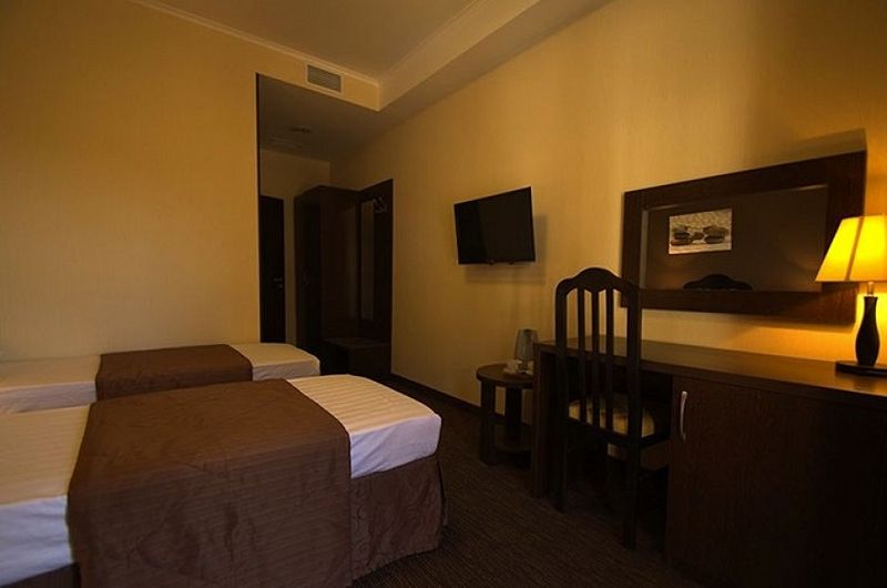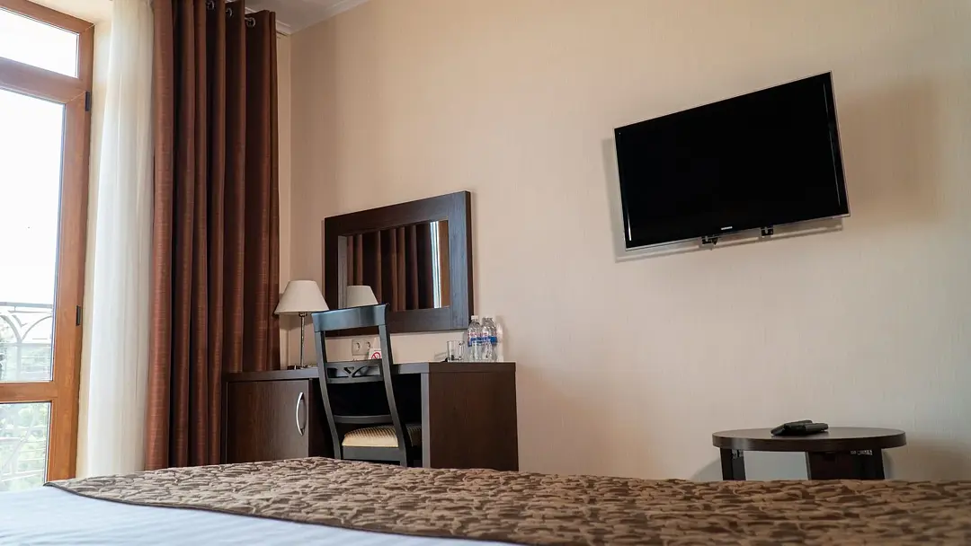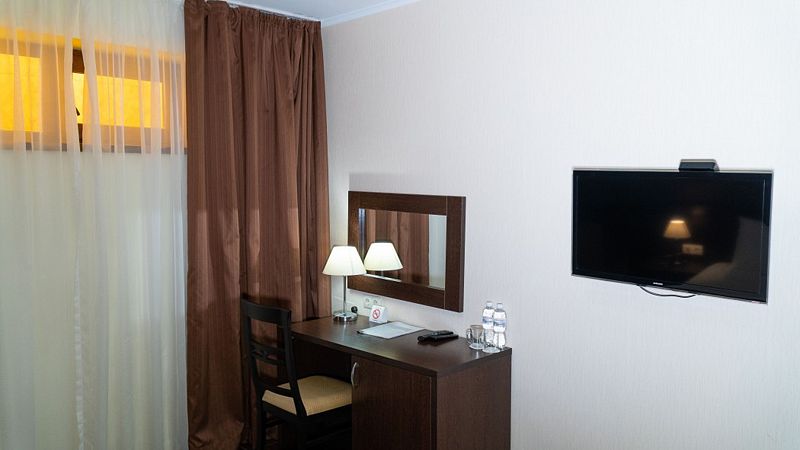 В номере двуспальная кровать, либо 2 односпальные кровати, 2 прикроватные тумбы, ЖК ТВ., письменный/туалетный стол с зеркалом и тумбой под холодильник, мини-холодильник, небольшой прикроватный столик, шкаф для одежды, багажная тумба, прихожая с зеркалом. В санузле имеется душ.