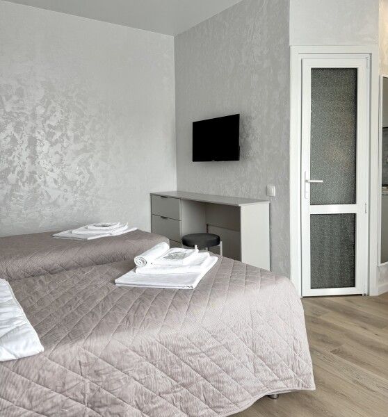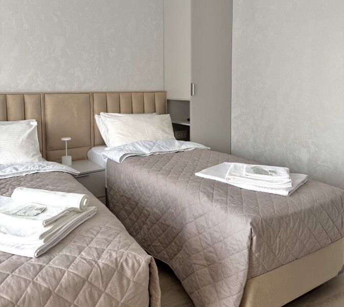Номера категории комфорт твин расположены на 1 этаже Апарт отеля. В номере есть все для комфортного проживания: полноценная кухонная зона с обеденным столом и варочной поверхностью, ванная комната, кондиционер, быстрый Wi-Fi, дополнительное спальное место, мини-холодильник, телевизор, чайник и посуда, тапочки, полотенца, фен.